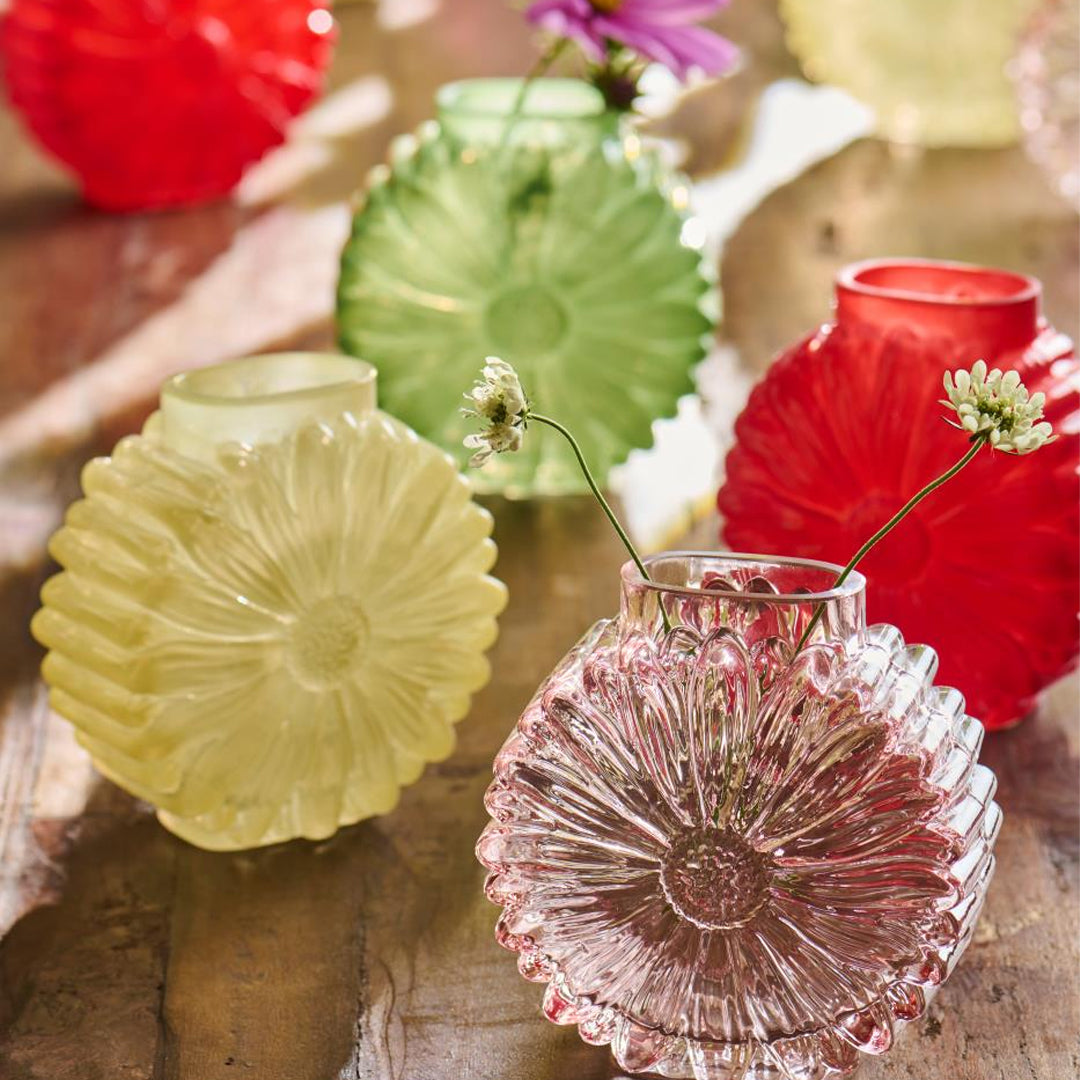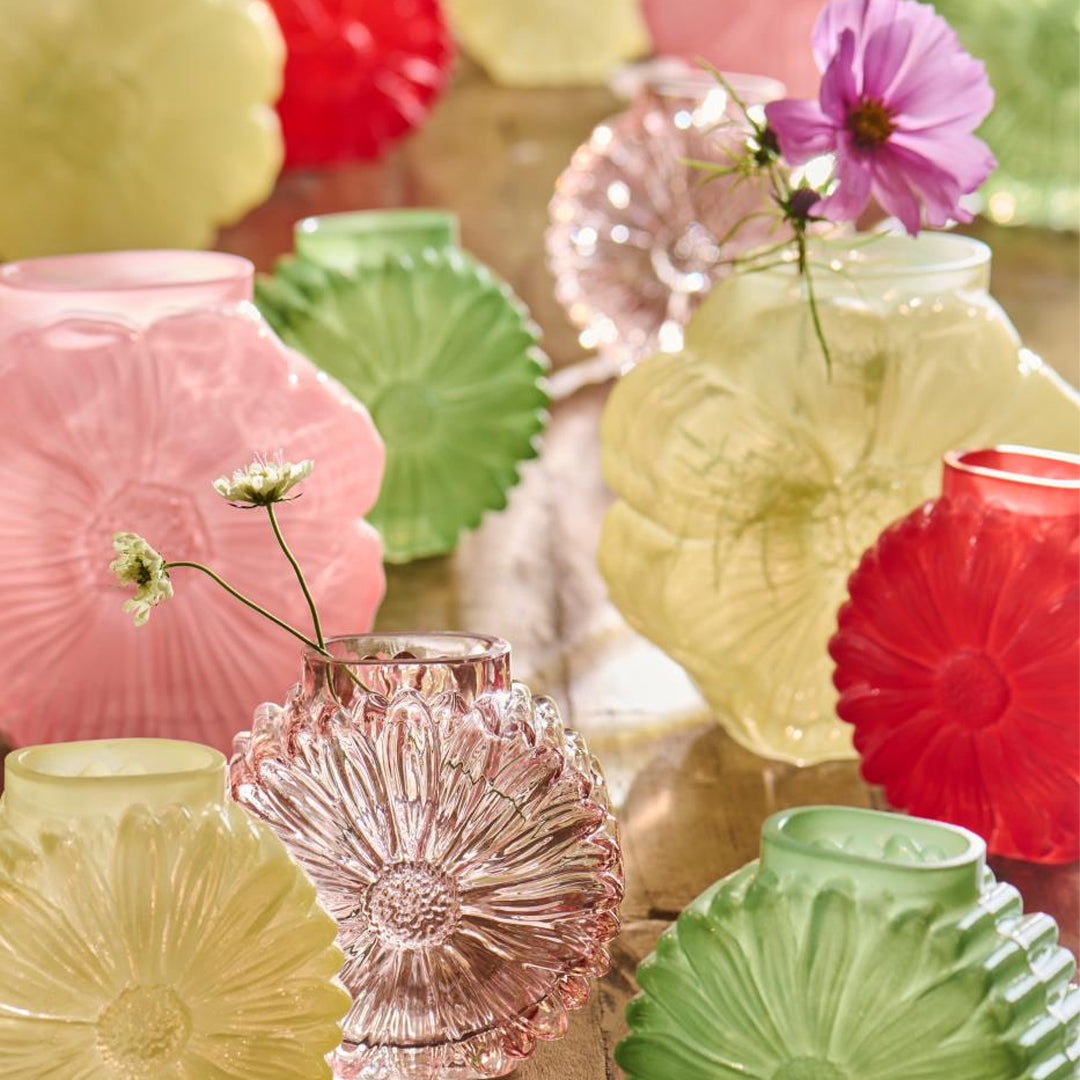 Daisy-vaserne er en frisk og legende tilføjelse til indretningen. De er fremstillet i farvet glas med en dekorativ blomsterform, der tilfører både struktur og farve til rummet.