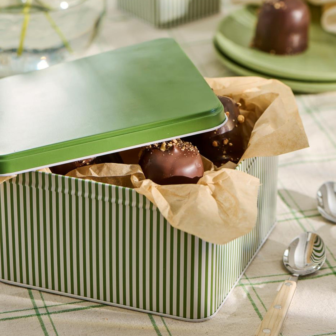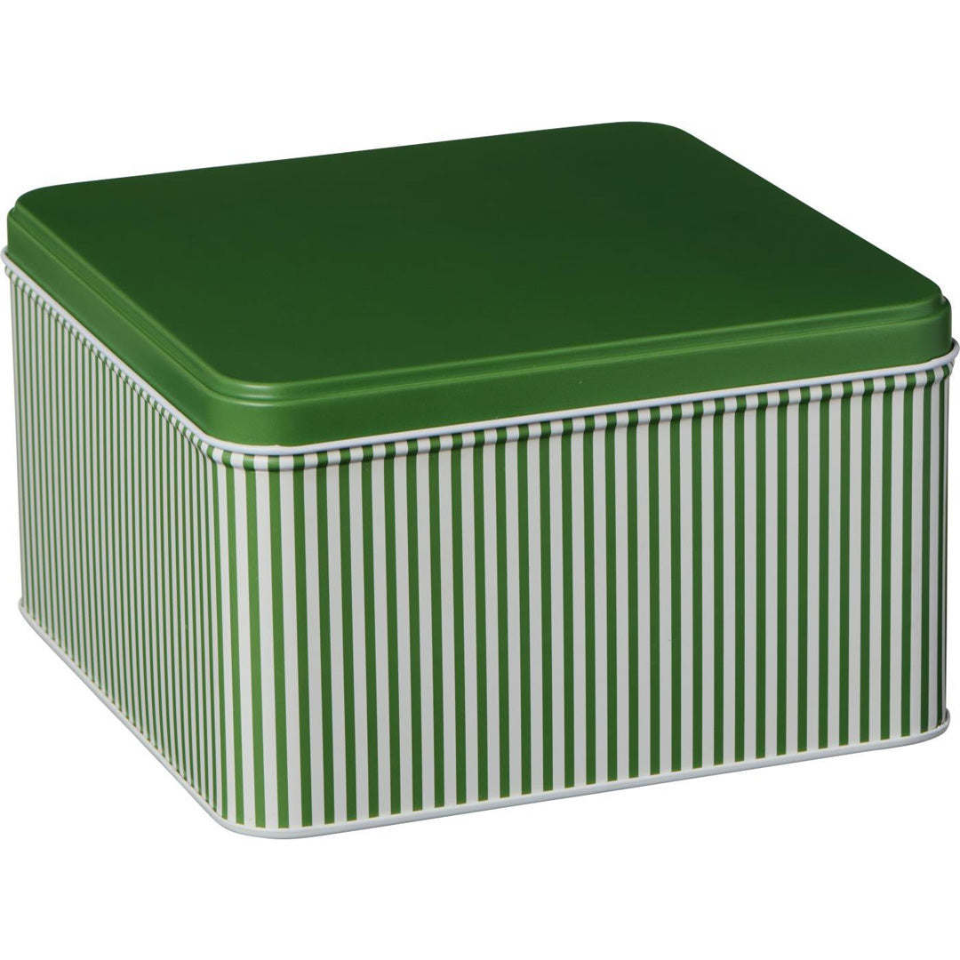 Elegant og funktionel metaldåse fra Ib Laursen med fine grønne striber og matchende fladt grønt låg. Den harmoniske grønne nuance kombineret med den klassiske stribede overflade giver et nostalgisk og stilrent udtryk, der passer perfekt ind i både køkken og stue.