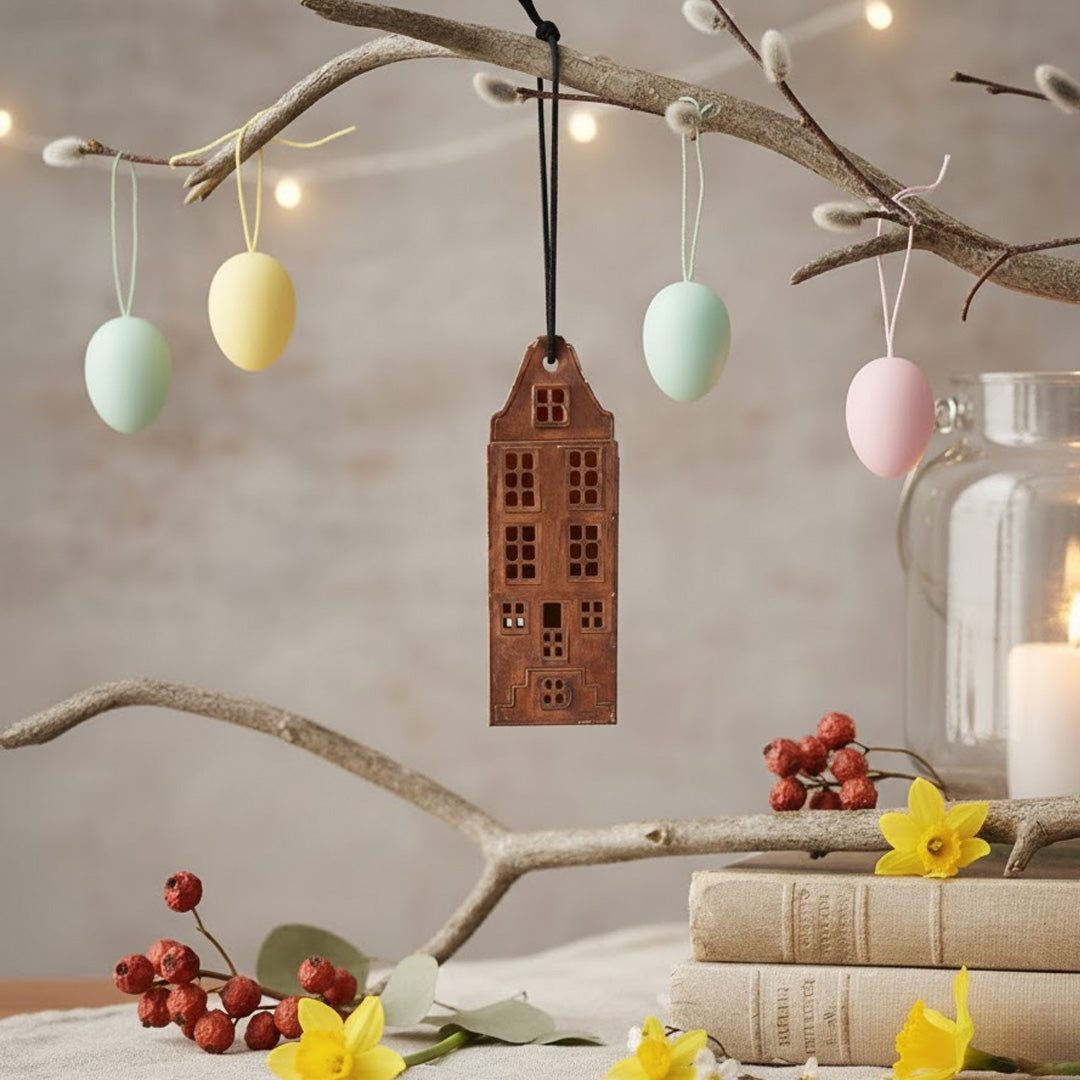 Det håndlavede ornament er udført i brun metal med fine udskæringer, der forestiller vinduer og døre, som fanger lyset og giver en hyggelig glød, når det hænger blandt grene eller i vinduet.