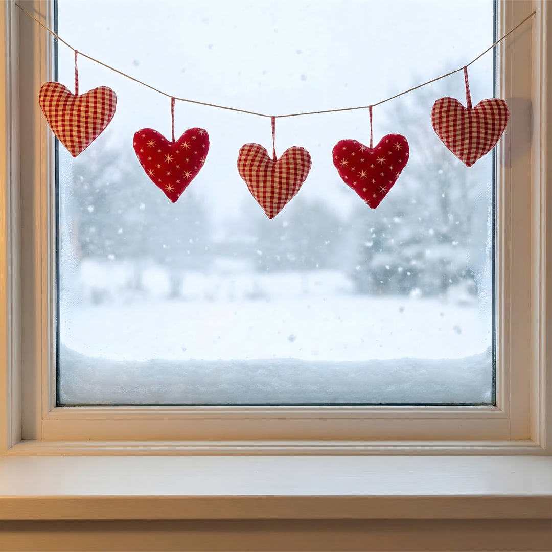 Skab en hyggelig og nostalgisk julestemning med denne smukke ranke bestående af fem håndlavede julehjerter. Hvert hjerte er syet i blødt bomuldsstof i varme røde nuancer – nogle med et charmerende stjernemønster, andre i et klassisk rødt og hvidt tern. Kombinationen giver et tidløst og hyggeligt udtryk, der passer perfekt til både moderne og traditionelle julemiljøer.