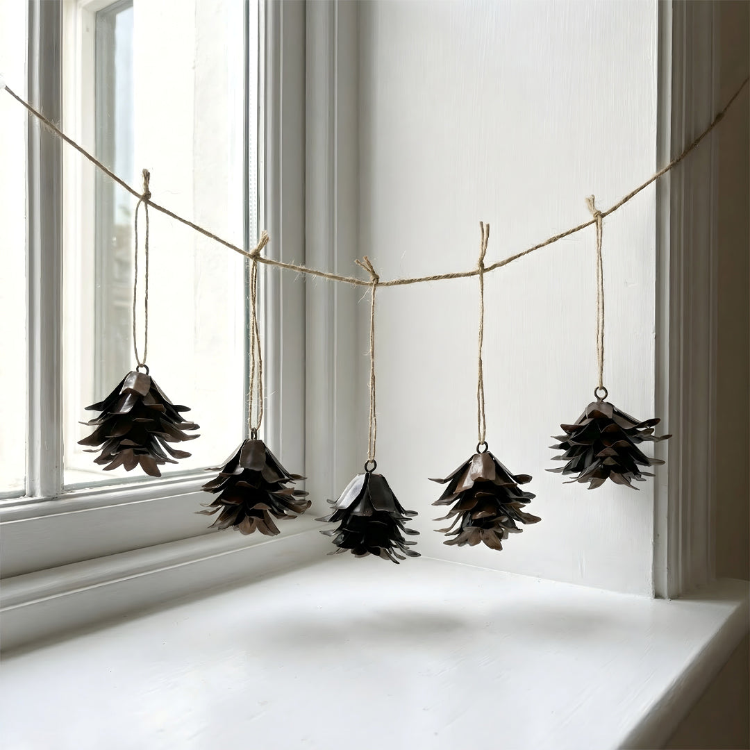 Tilføj et naturligt og stemningsfuldt udtryk til din julepynt med denne dekorative ranke fra Moonmind. Ranken består af fem ens kogler i lakeret metal, formet med fine detaljer, der giver et realistisk og elegant helhedsudtryk. Den mørke, lakerede overflade tilfører varme og dybde og gør ornamenterne perfekte til både moderne og klassiske dekorationer. Ideel til ophæng på en gren, i vinduet eller som del af en dekorativ juleopstilling.