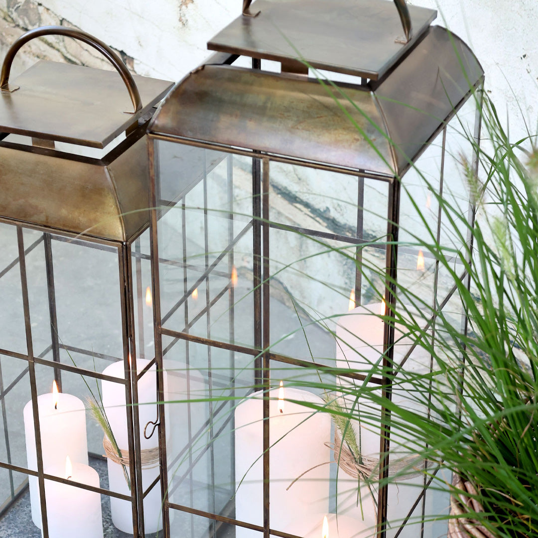 Skab hygge og varme i dit hjem eller på terrassen med denne elegante lanterne med gitterdesign fra Chic Antique. Det klassiske design i antique messing og de store glasflader gør den perfekt til at fremhæve lysets skær – både indendørs og udendørs under tag.