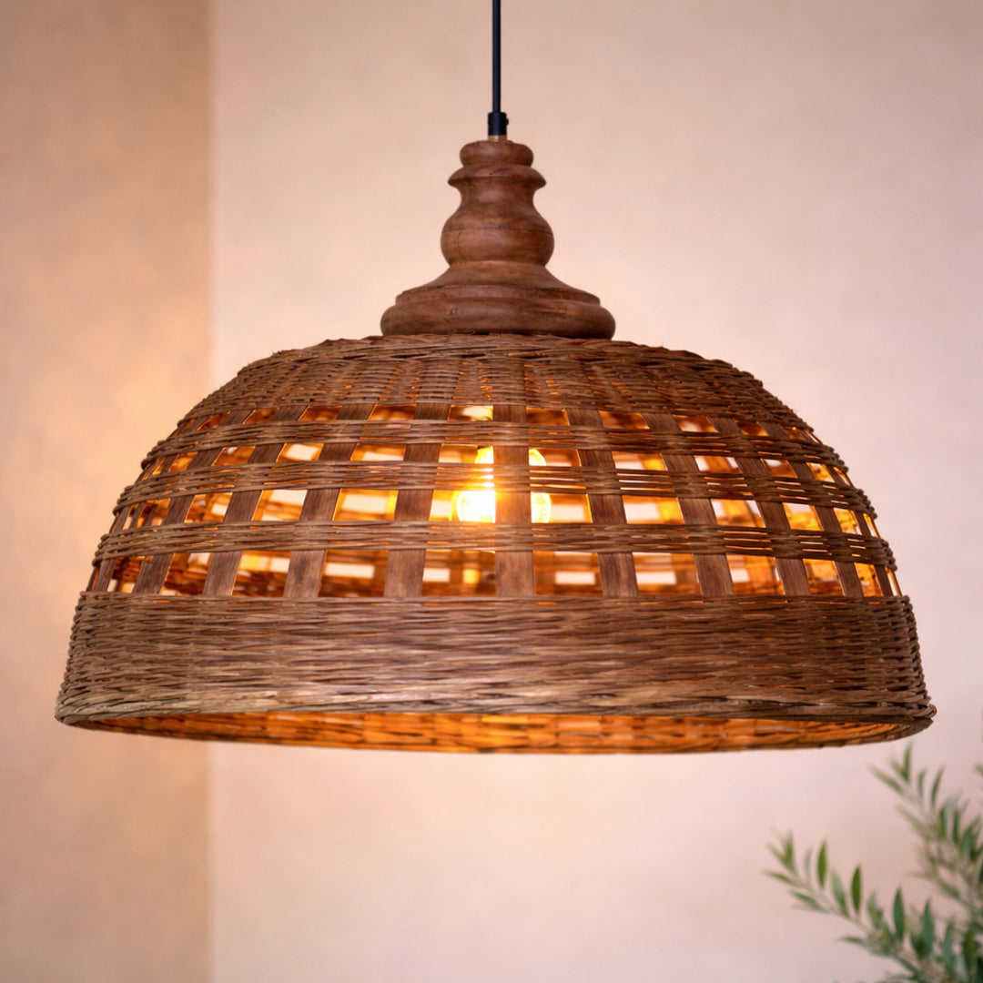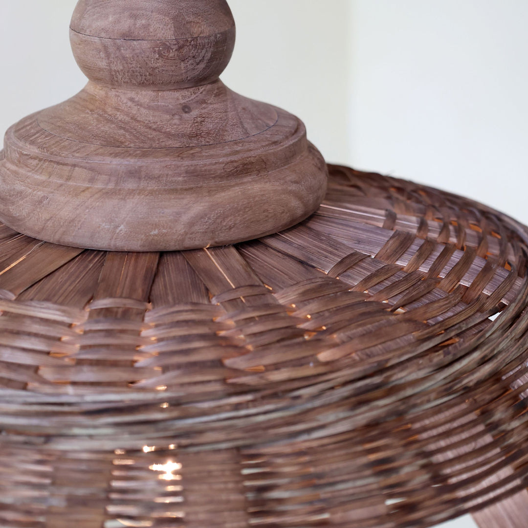 Denne ekstra brede pendel i rattanflet er et markant statement-piece, der tilfører rummet varme, karakter og naturlig elegance. Den flade, brede form kombineret med den dekorative top i mangotræ skaber et roligt, men samtidig iøjnefaldende udtryk. Det åbne fletmønster lader lyset slippe smukt igennem og giver en blød, stemningsfuld belysning.