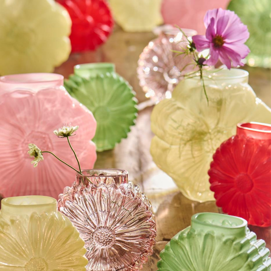 Daisy-vaserne er en frisk og legende tilføjelse til indretningen. De er fremstillet i farvet glas med en smuk blomsterform, der tilfører både farve og karakter til rummet.
