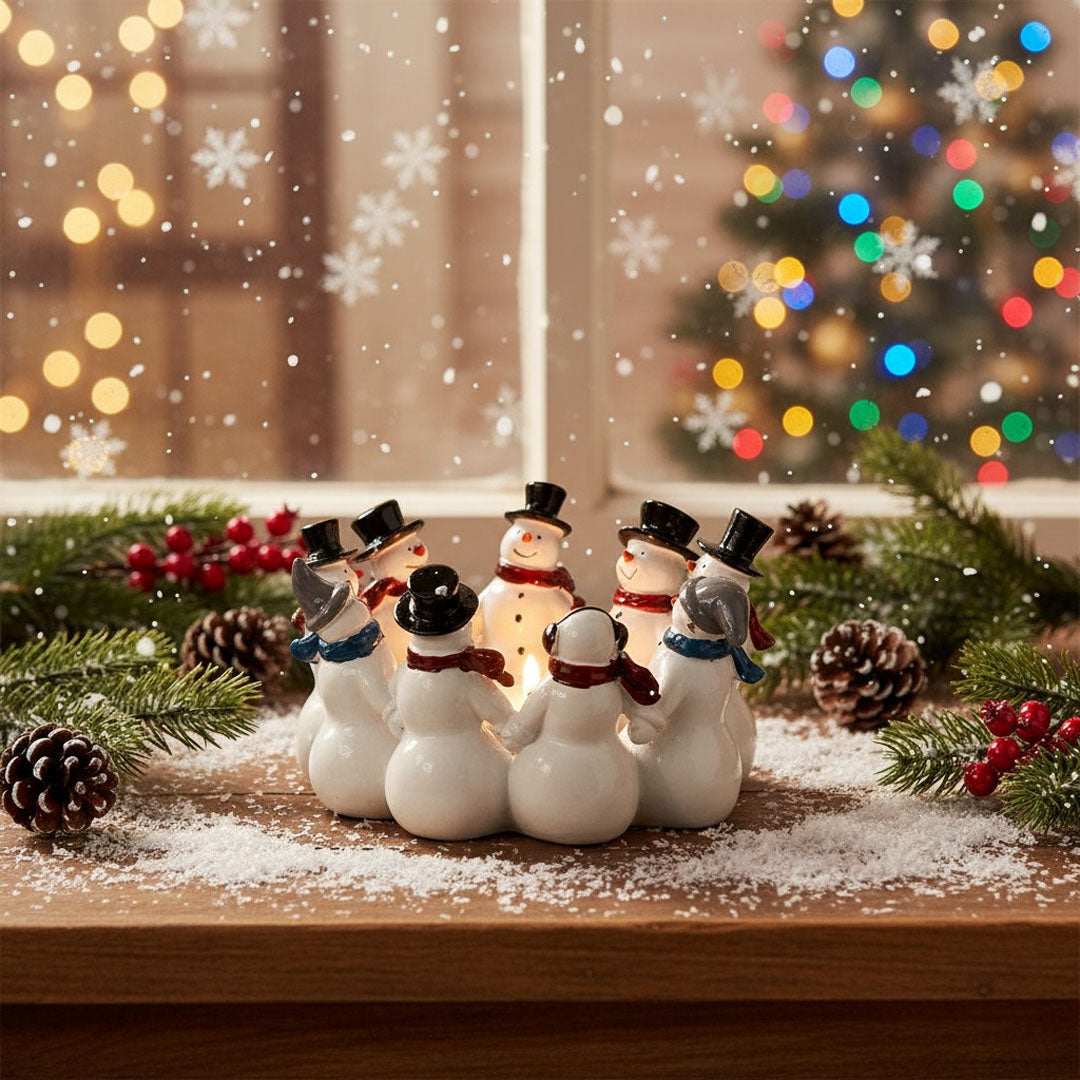 Bring vinterens magi ind i dit hjem med denne charmerende snemandsring fra Harvesttime. Figuren viser en kreds af glade snemænd, der holder hinanden i hånden, og som danner plads til et fyrfadslys i midten. Når lyset tændes, spreder det en hyggelig og varm atmosfære i de kolde vinteraftener.