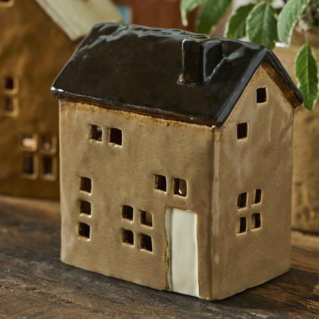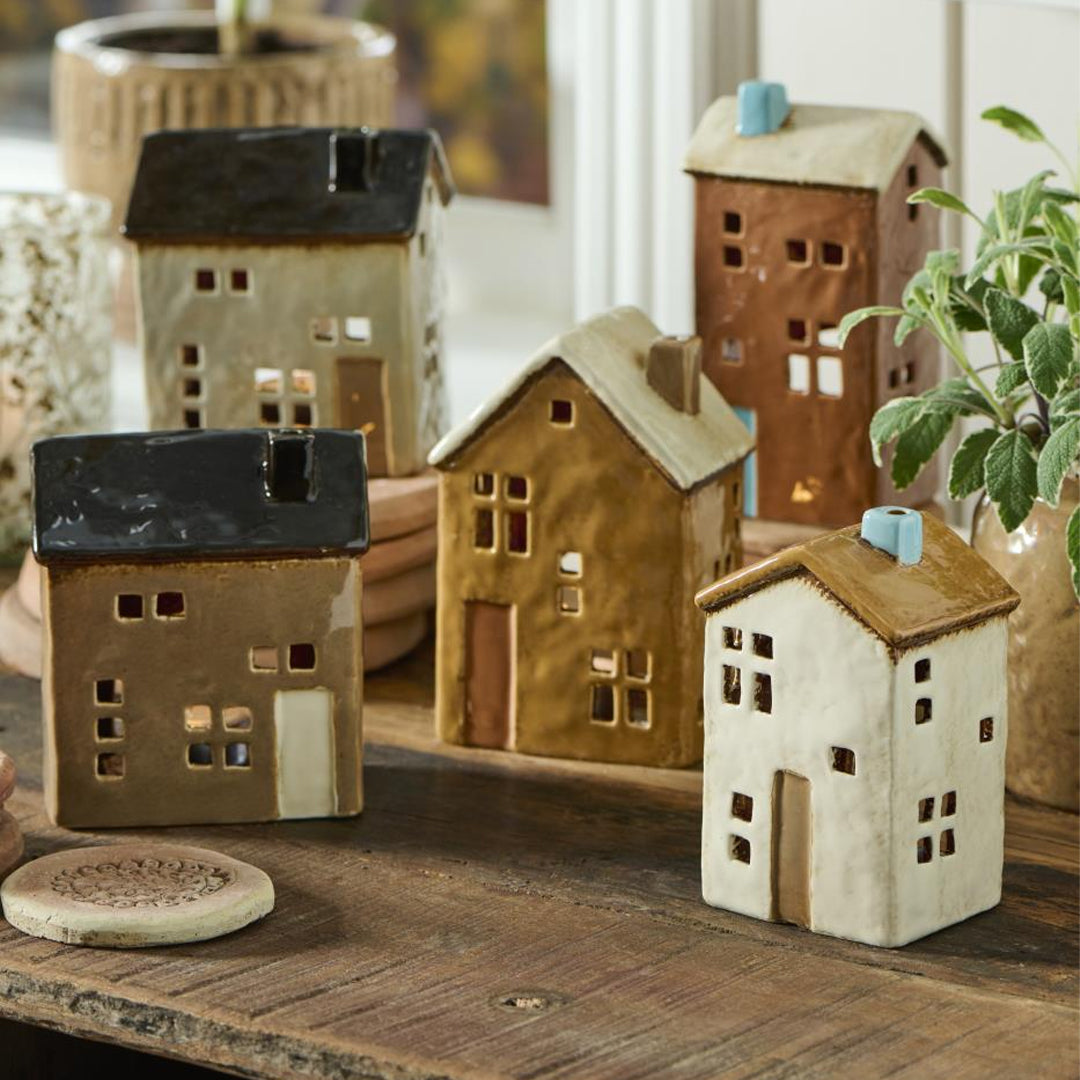 De små, populære keramikhuse rammer tidens trend med at indrette med kunsthåndværk i hjemmet. Der er altid en grad af uforudsigelighed i glasering af keramik, og under brændingen kommer farverne til live. Det er netop det, der giver et unikt og originalt udtryk til de små huse, med små farveforskelle og rustikke kanter.
