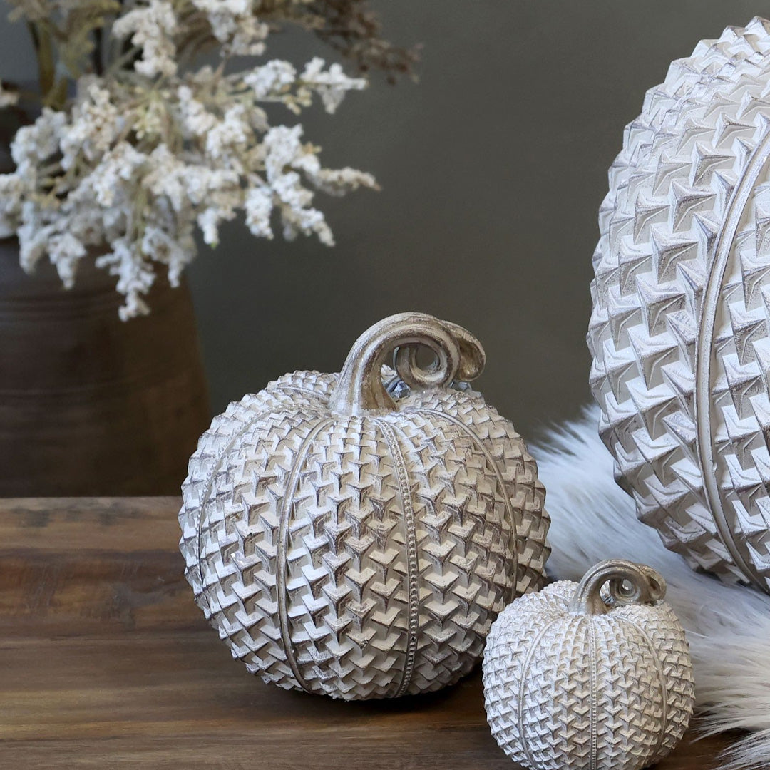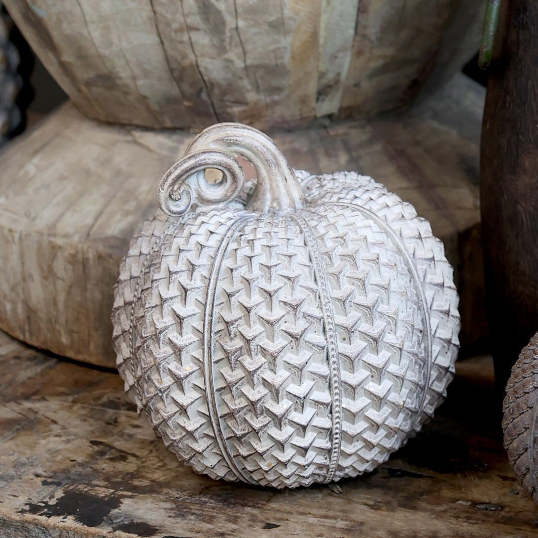 Løft din efterårsdekoration med dette karakterfulde græskar fra Chic Antique. Den antique latte-farvede overflade kombineret med en forgyldt stilk og unik mønsterstruktur skaber en elegant og rustik stemning i både bolig og have.