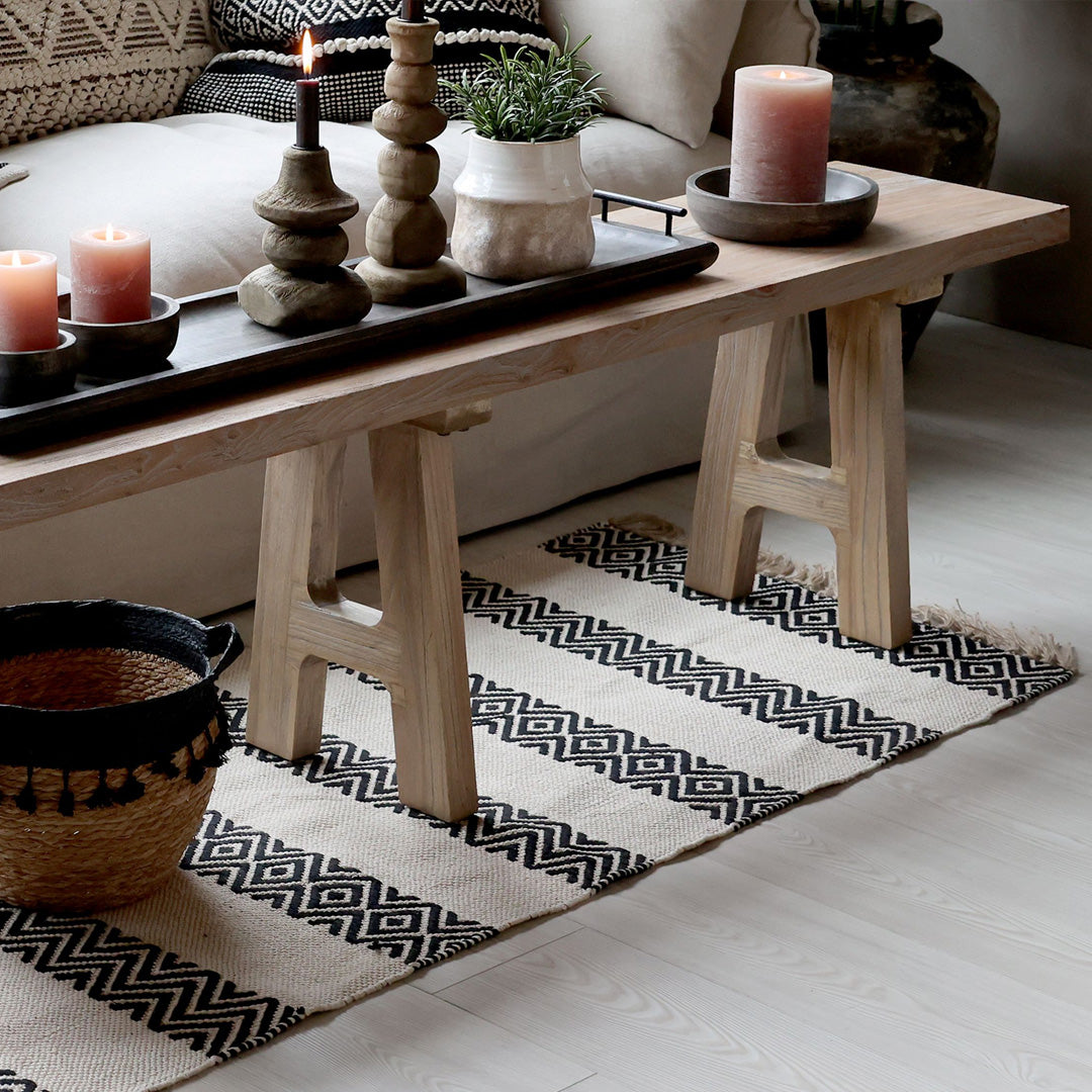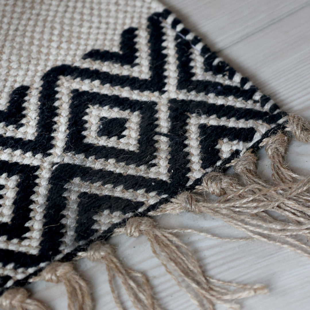 Skab kontrast og karakter i dit hjem med denne elegante løber med hvid-sort mønster fra Chic Antique. Den håndvævede struktur i bomuld og jute tilfører varme og naturlighed, mens det grafiske mønster skaber kant og stil.