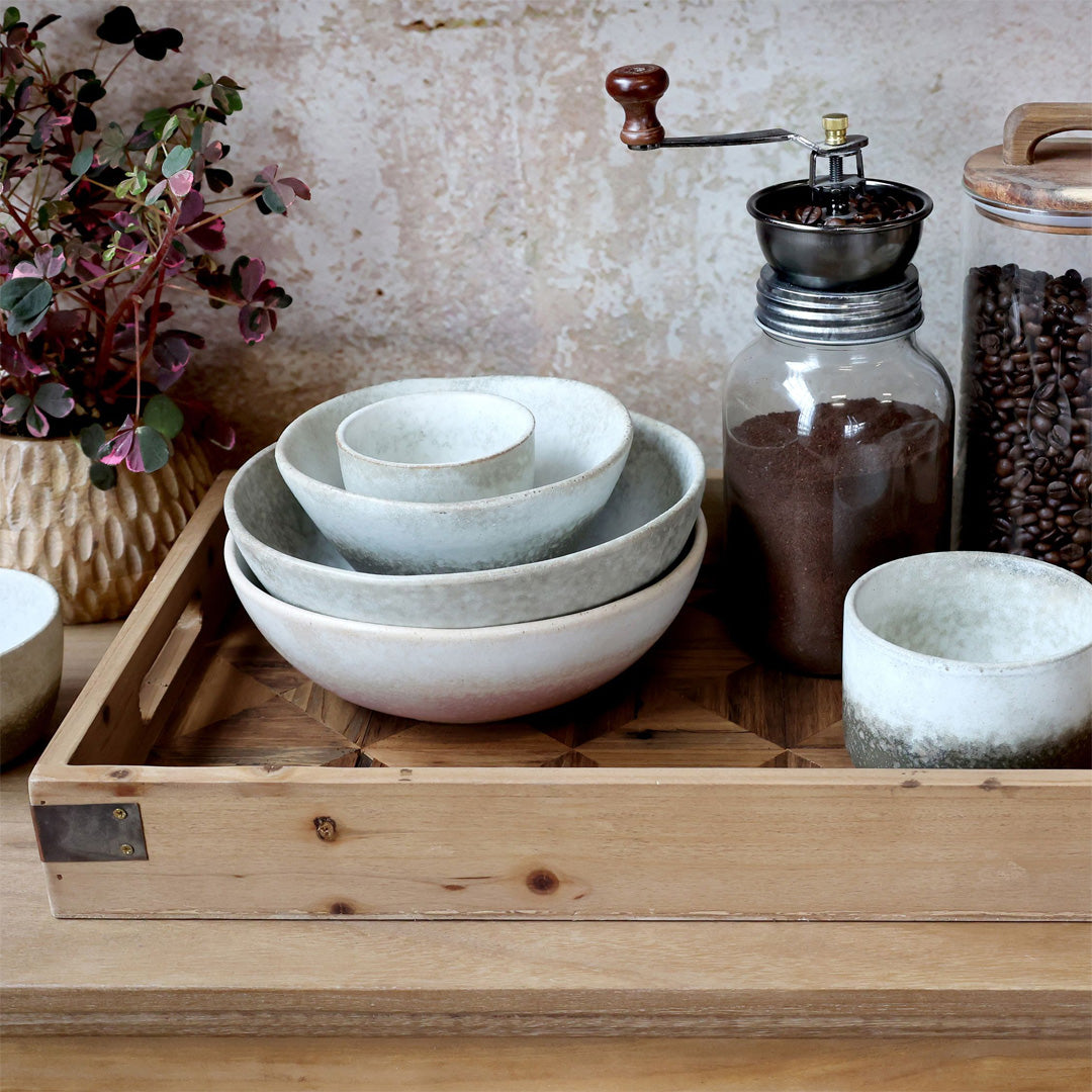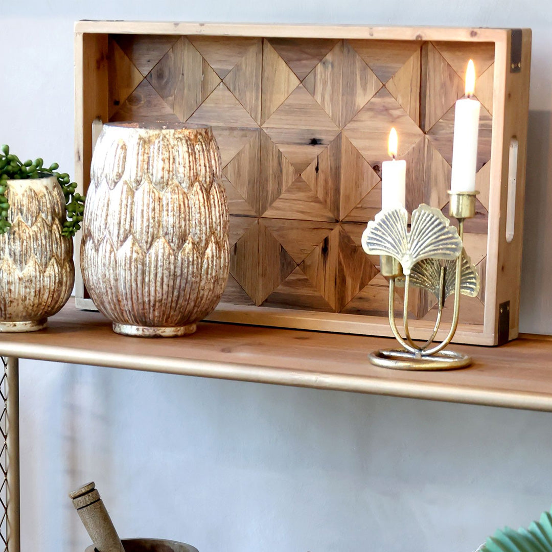 Bakken er både praktisk og dekorativ – ideel til servering af morgenkaffe på sengen, som underlag til stearinlys og planter eller som et stilfuldt element på spisebordet. De udskårne håndtag og metalforstærkede hjørner giver et råt og industrielt udtryk.