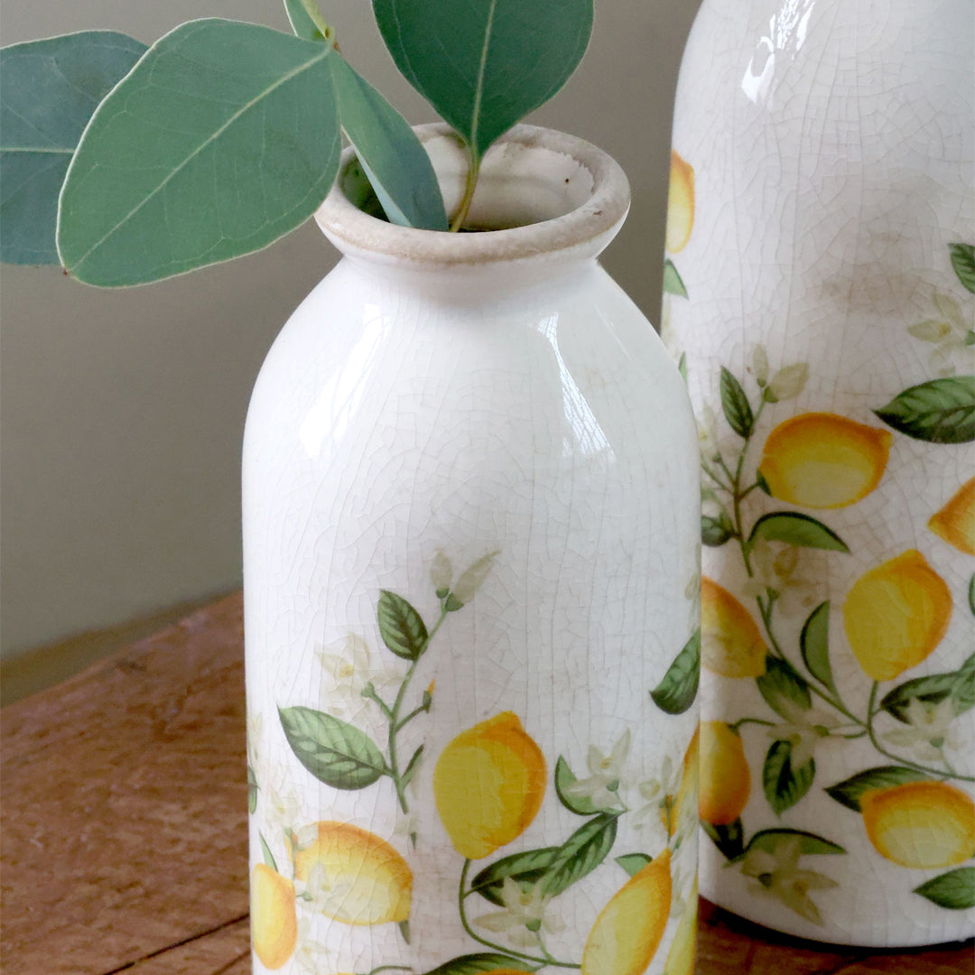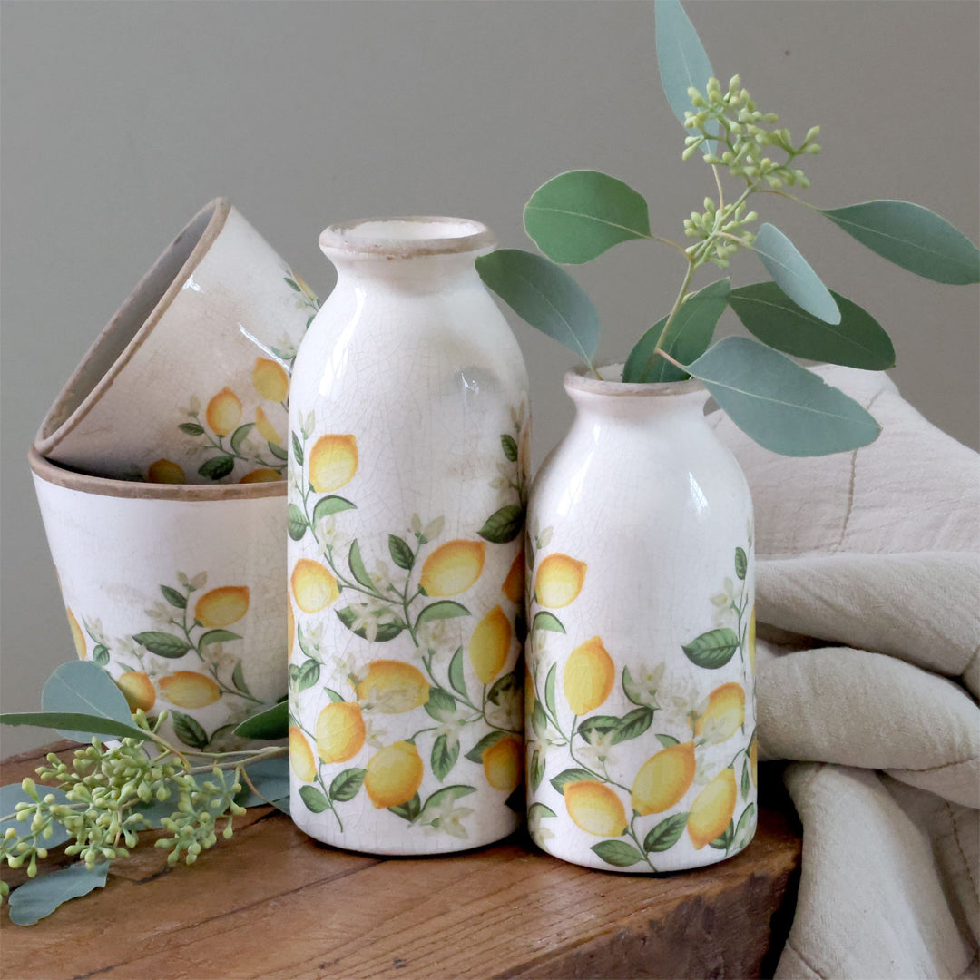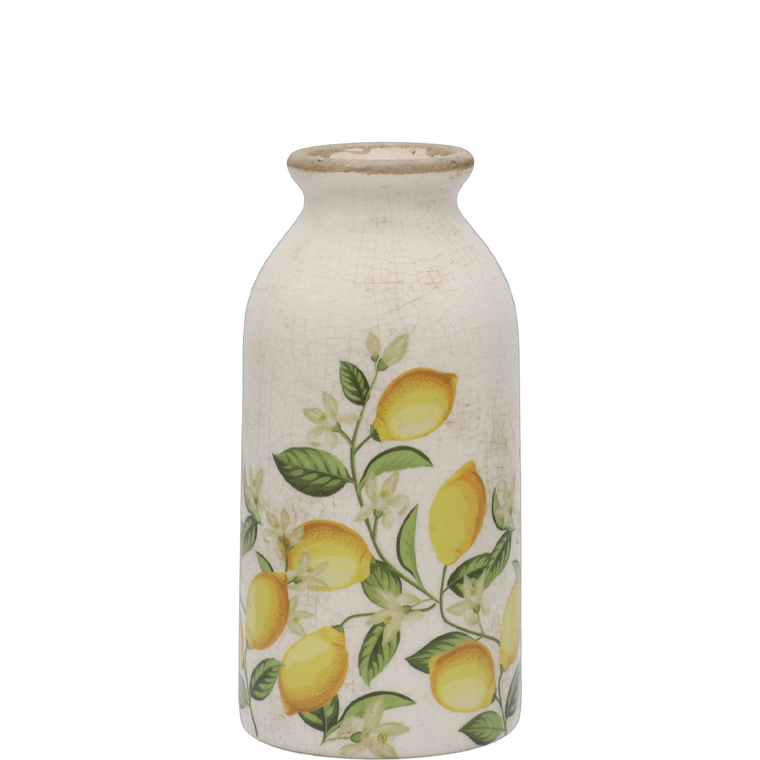Dekorativ og håndmalet flaske i keramik, prydet med citroner og blomster i en blød cremefarve. Det friske, sydlandske udtryk tilfører charme og personlighed til både indendørs og udendørs indretning. Flasken fungerer smukt som dekorationsobjekt alene eller i kombination med seriens skjulere. Da produktet er håndmalet, kan der forekomme variationer i farve og finish, hvilket gør hver flaske unik.