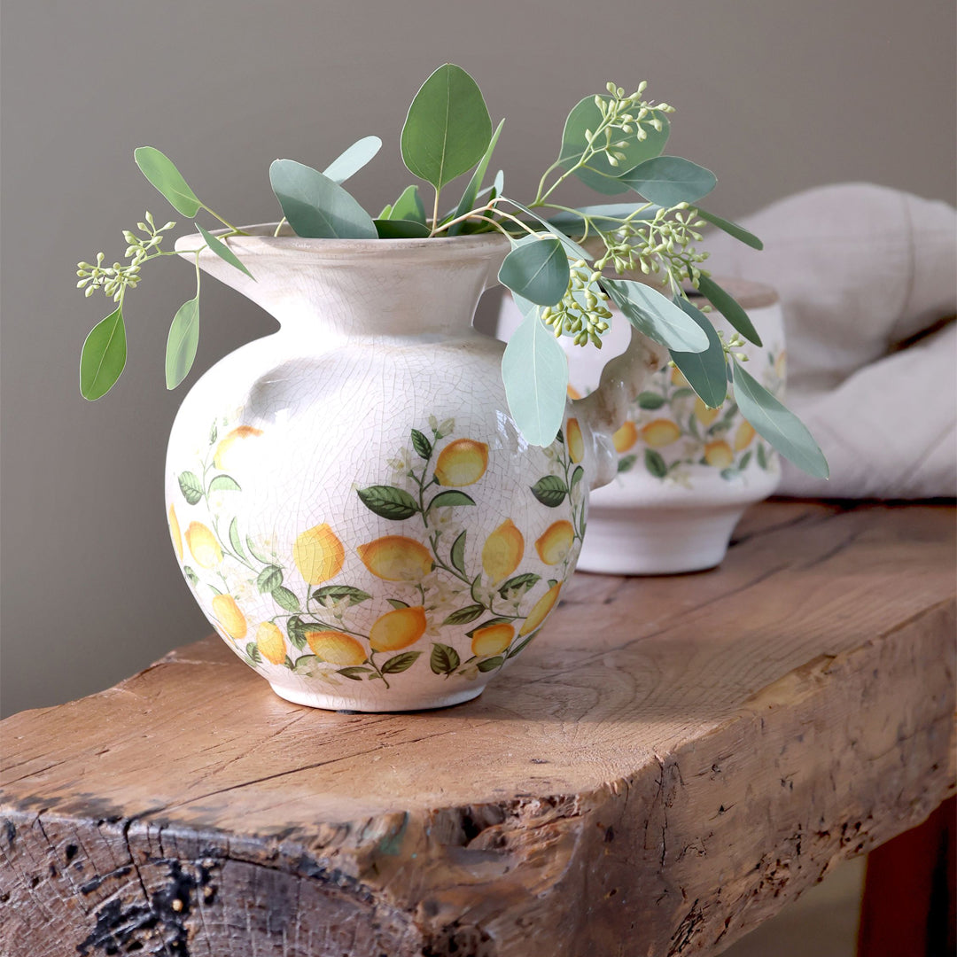 Smuk og dekorativ kande i keramik, håndmalet med citroner og blomster i en blød cremefarve. Det friske, mediterrane udtryk giver et levende og sommerligt præg, som passer perfekt både indendørs og udendørs. Kanden fungerer flot som dekorationsobjekt, vase eller til servering, og hver enkelt kande har sit eget unikke udtryk takket være den håndmalede finish.