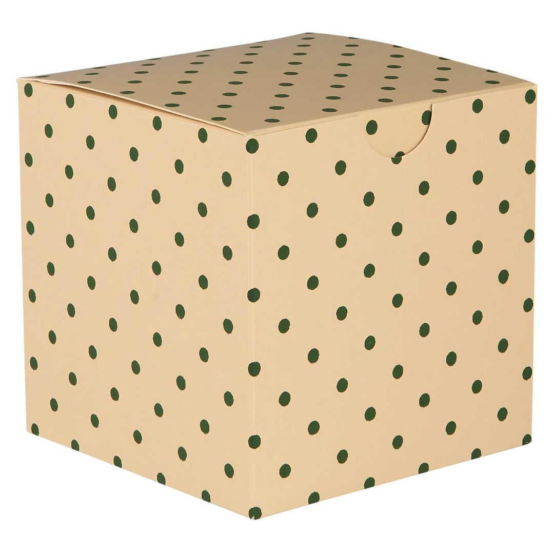 Praktisk og dekorativ foldeæske med grønne prikker, perfekt til små gaver og søde overraskelser.