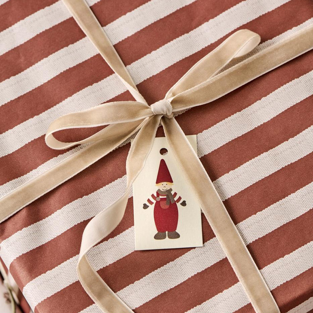 Smukt og holdbart gavepapir med røde striber og tekstil-look, lavet af 100% genbrugspapir – perfekt til elegant gaveindpakning.