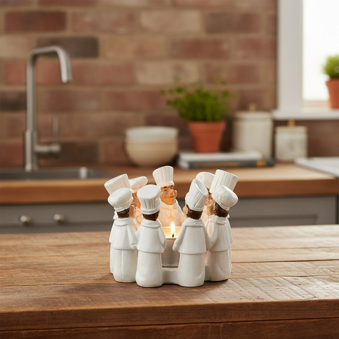 Skab en festlig og hyggelig stemning med denne Kokkering Le Chef fra Harvesttime. Figuren forestiller en kreds af glade kokke, der står omkring et fyrfadslys, og spreder både varme og humor i dit hjem. Perfekt som julepynt, men også oplagt til køkkenet året rundt som en sjov og charmerende detalje.