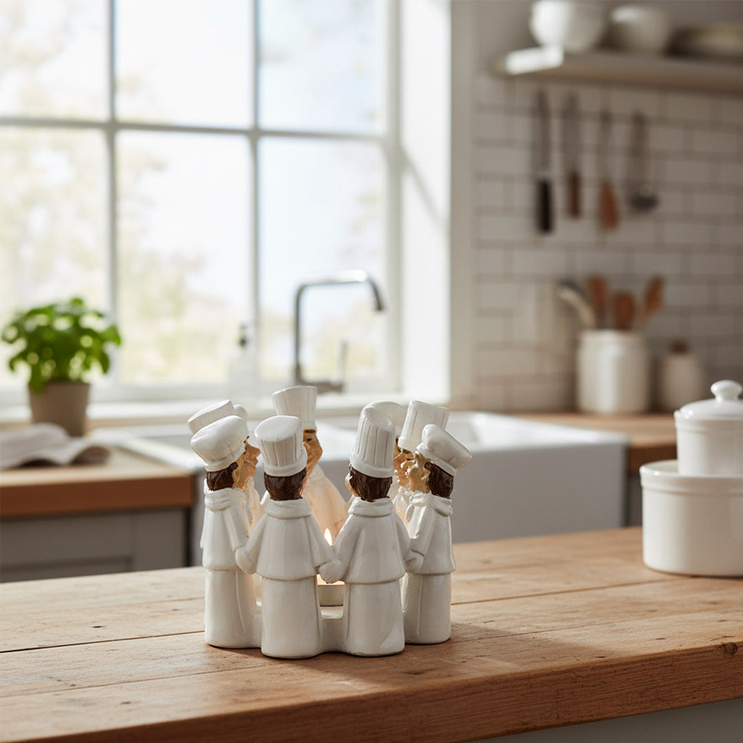 Bring både hygge og humor ind i dit hjem med denne charmerende Kokkering Le Chef fra Harvesttime. Figuren forestiller en gruppe kokke, der står i ring omkring et fyrfadslys, hvilket skaber en varm og indbydende atmosfære. Perfekt som gaveidé til madentusiaster eller som en sjov detalje i køkkenet og hjemmets julepynt.