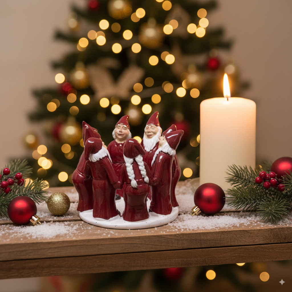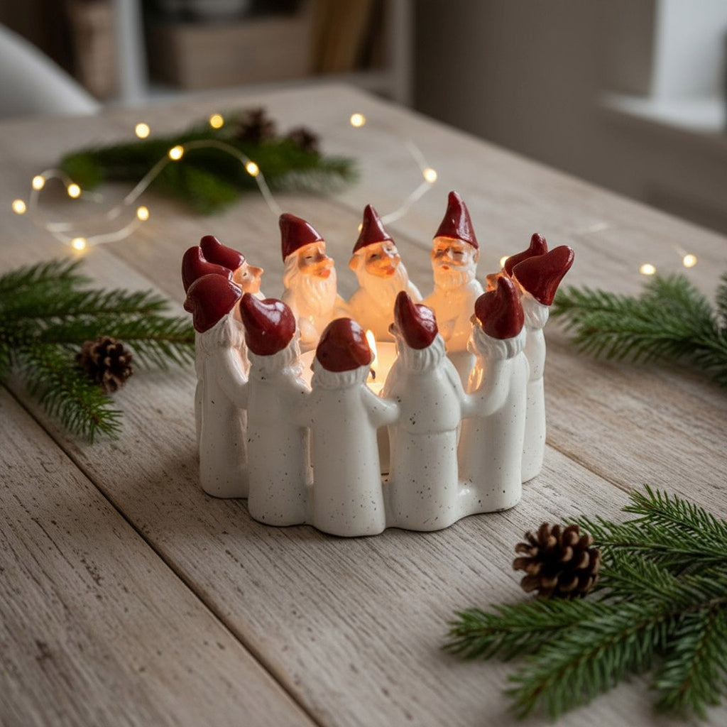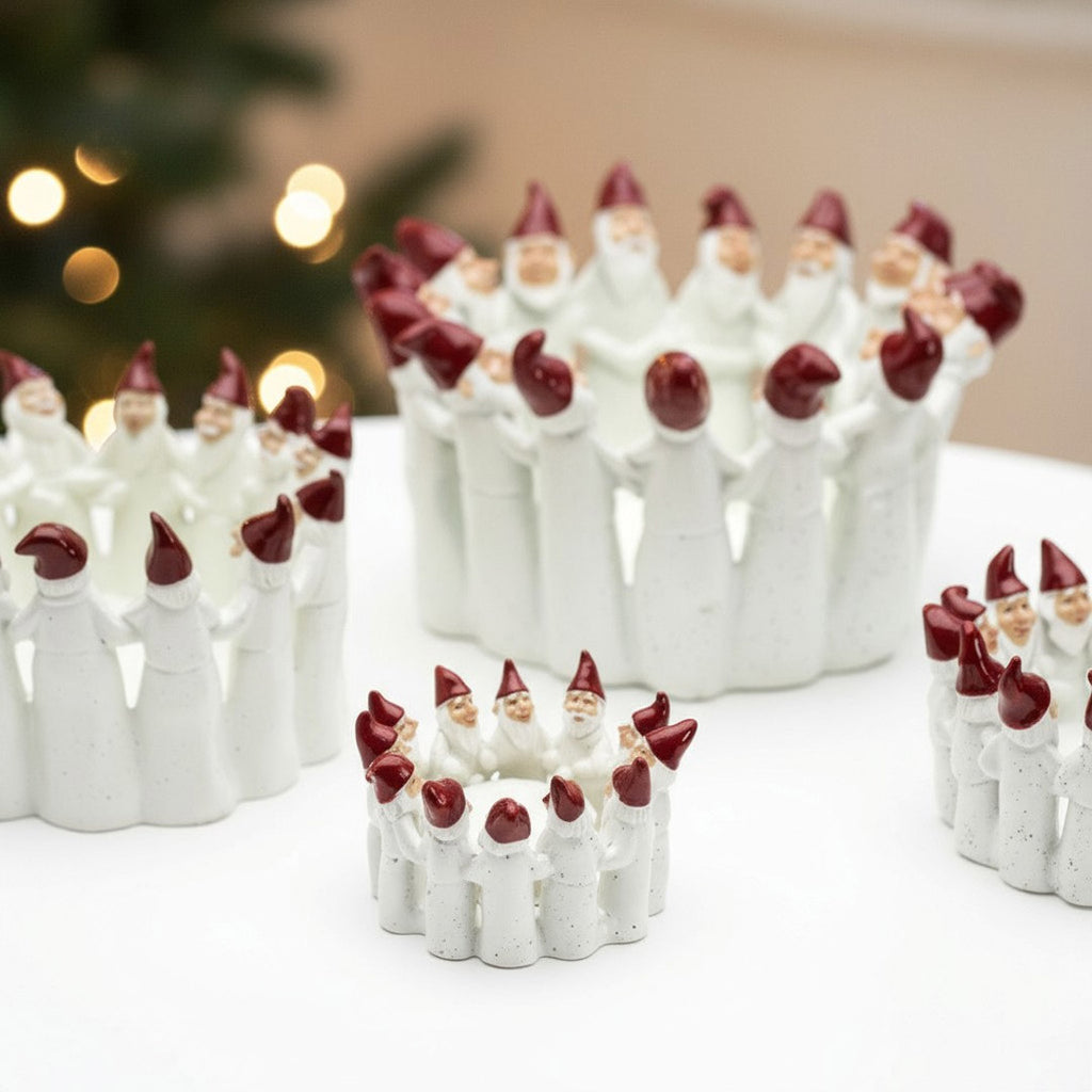 Tomteringe er charmerende figurer, hvor små nisser står i rundkreds omkring et fyrfadslys. Når lyset tændes, spreder de varme og glæde i hele rummet. De findes i mange forskellige modeller og størrelser – fra små dekorative varianter til større figurer, der bliver et naturligt midtpunkt i julepynten.