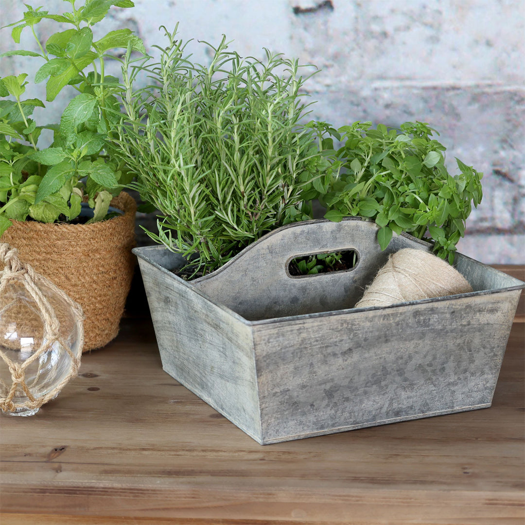 Denne dekorative kasse i antique zink kombinerer funktionalitet og et råt, industrielt udtryk. Med sit enkle design og praktiske håndtag er den ideel til opbevaring af alt fra krydderurter og redskaber til småting i hjemmet.