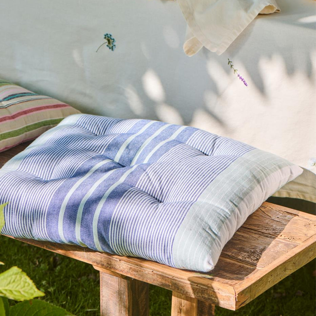 Skab komfort og farvespil i indretningen med denne bløde siddehynde i bomuld. De klassiske blå og hvide striber giver et friskt udtryk, mens den fyldige polstring (75% bomuld, 25% polyester) gør stolen mere behagelig. Perfekt til køkkenet, terrassen eller hyggelige siddepladser rundt omkring i hjemmet.
