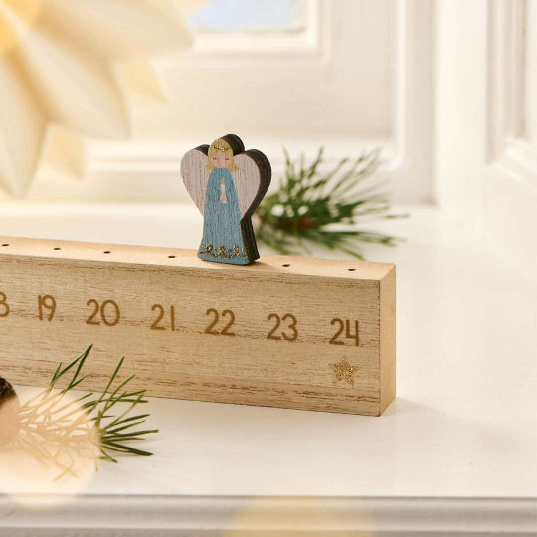 Skab juleglæde og hygge i december med denne fine julekalender i træ. Kalenderen er udstyret med tallene 1 til 24 og en sød engel, som flyttes dag for dag, indtil det endelig er juleaften.