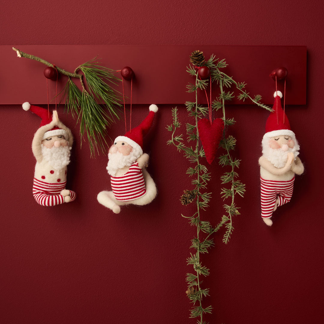 Tilføj charme og hygge til julepynten med disse håndlavede yoga-nisser i filtet uld. Serien af unikke figurer er designet til at hænge, så de kan pynte smukt på grene, i vinduer eller som en del af årets juledekorationer.