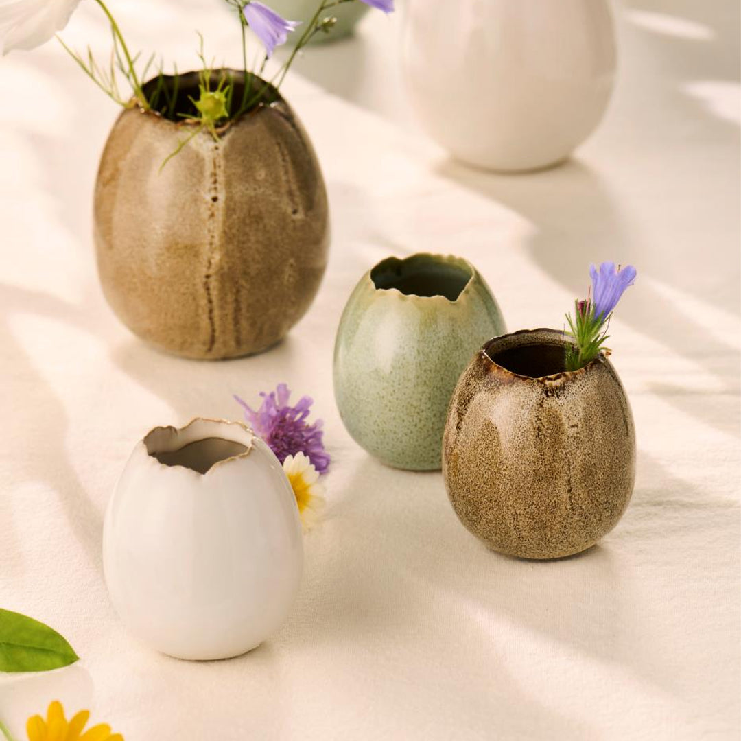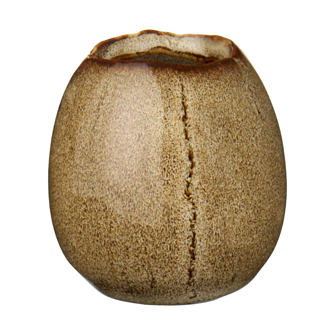 Denne lille ægformede minivase i stentøj har et enkelt og blødt udtryk, der tilfører ro og lethed til indretningen. Den brune glasur understreger det naturlige look og gør vasen nem at kombinere med andre dekorative elementer.