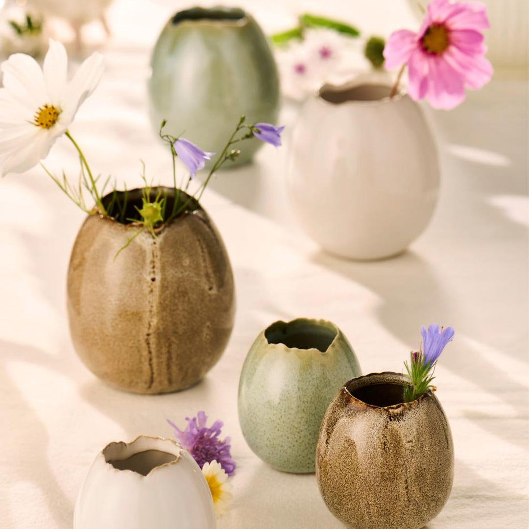 Denne ægformede minivase i stentøj forener enkel form med et blødt, naturligt udtryk. Den afdæmpede grønne glasur giver vasen et roligt og harmonisk look, som passer smukt ind i både moderne og klassiske indretninger.