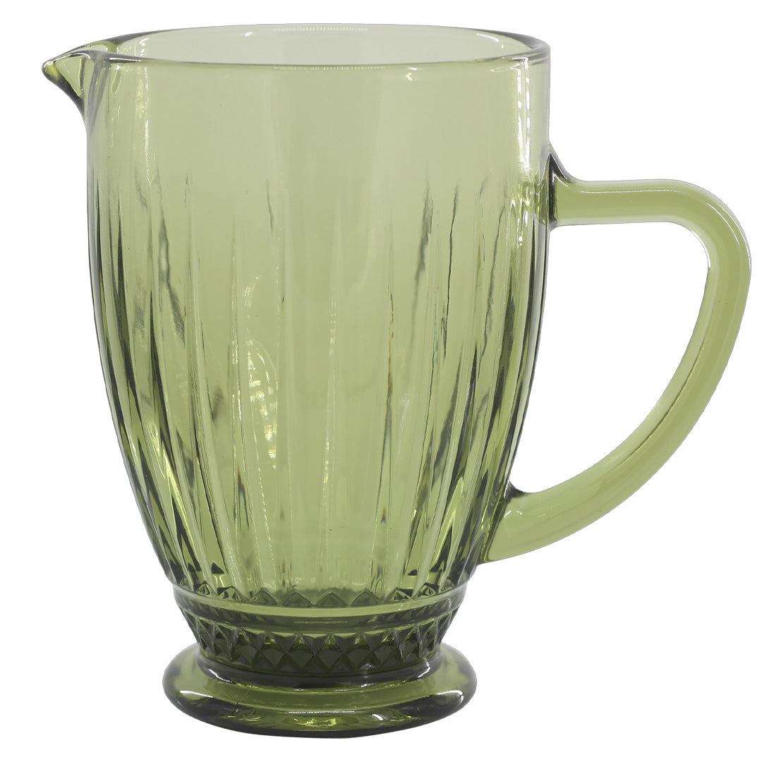 Stilfuld glaskande i olivengrøn med elegant reliefmønster, der giver borddækningen karakter. Den klare form gør den ideel til vand, lemonade og kolde drikke – både til hverdag og gæster. Praktisk i brug og let at rengøre.