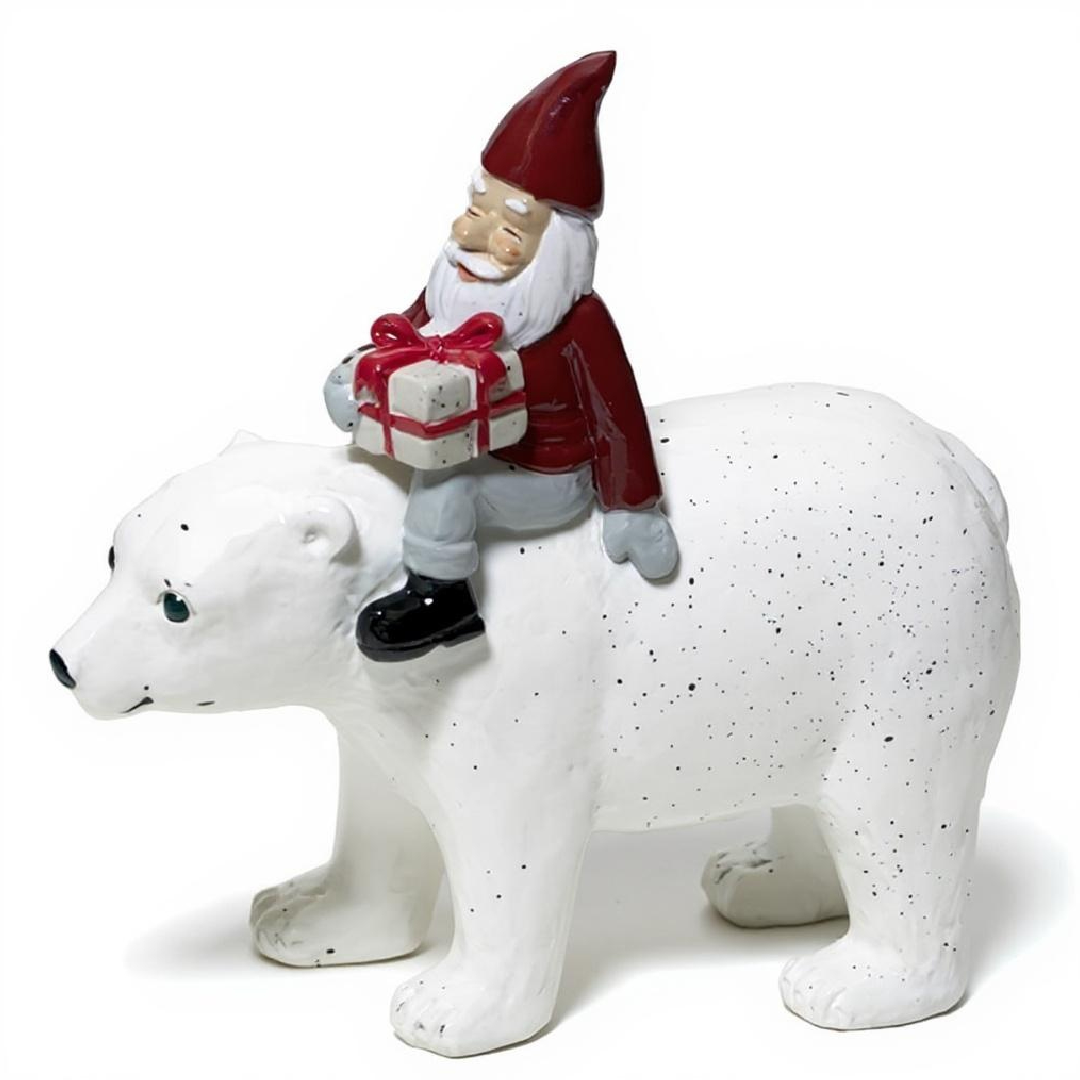 Tilføj et eventyrligt og vinterligt touch til julepynten med denne charmerende figur, hvor julemanden rider på en isbjørn med en gave i hænderne. Den håndmalede detaljegrad og det humoristiske udtryk gør figuren til et varmt og iøjnefaldende indslag i hjemmet.