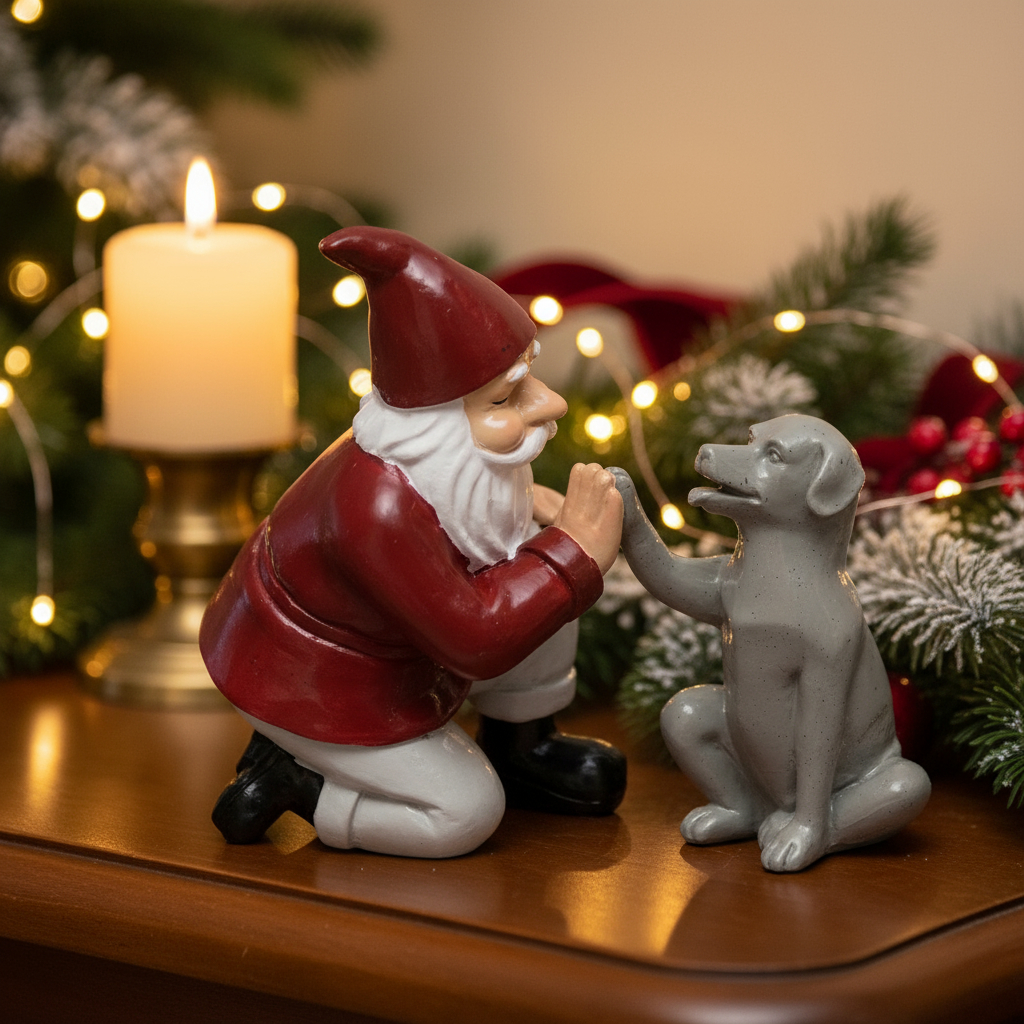 Bring smil og julehygge ind i hjemmet med denne charmerende figur fra Harvesttime, hvor en glad nisse giver en sød hund en high five. Figuren kombinerer traditionel julecharmé med et humoristisk twist og passer perfekt ind i både klassisk og moderne julepynt.