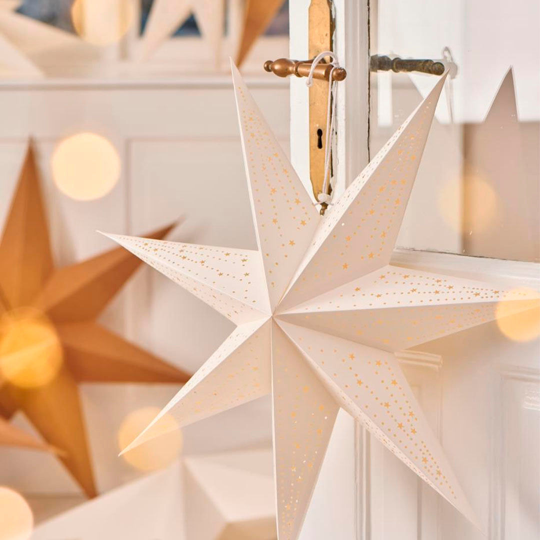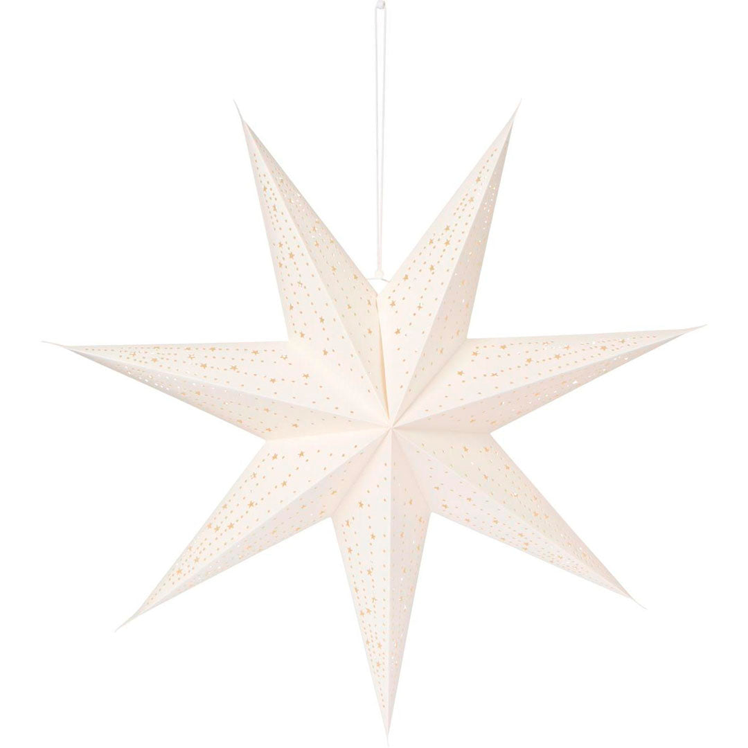 Elegant 7-kantet ophængsstjerne i hvidt papir med fint hulmønster. Perfekt som dekorativ ophængning i vinduer, på vægge, i loftet eller som del af en iøjnefaldende installation i hjemmet.