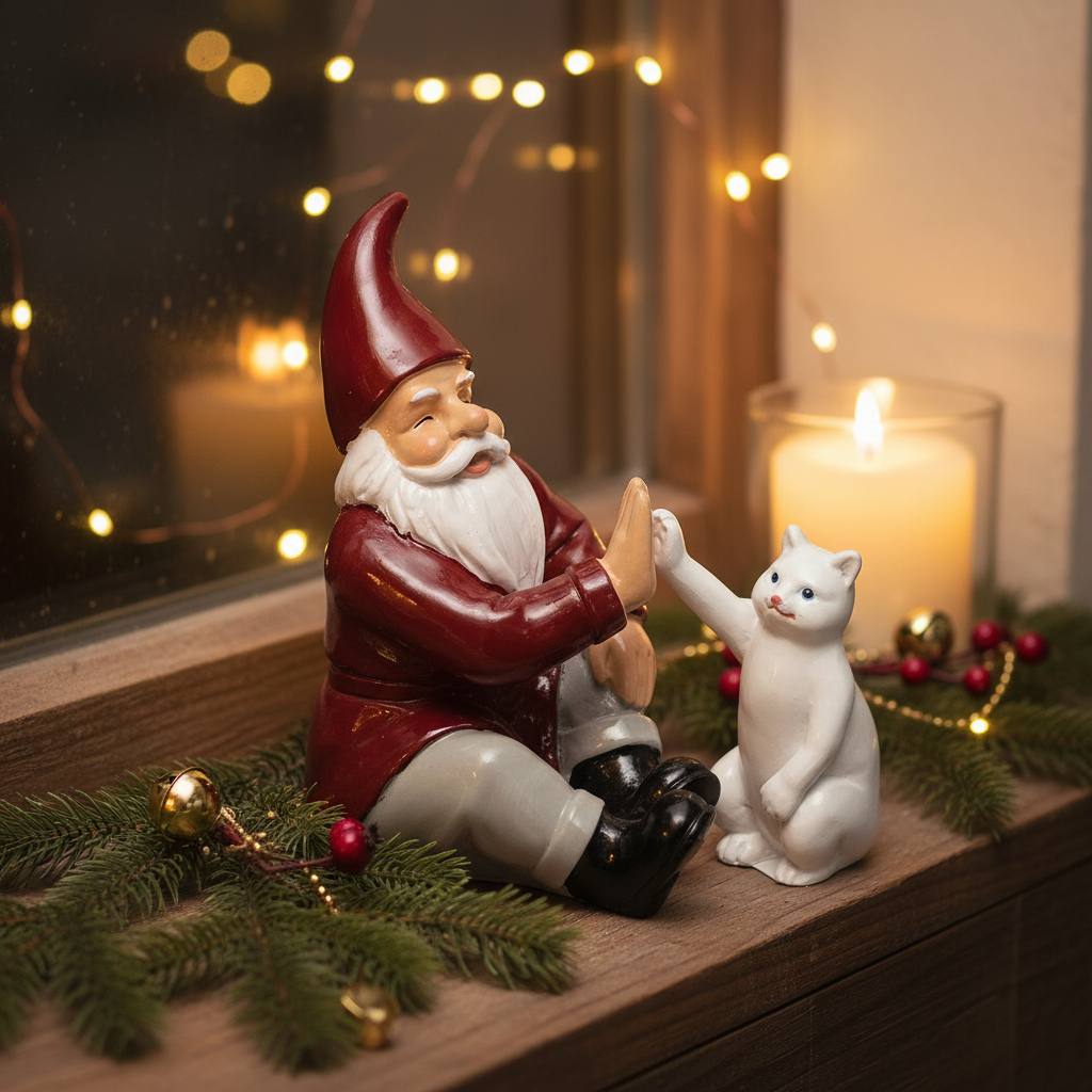 Skab smil og julehygge med denne charmerende figur fra Harvesttime, der forestiller en glad nisse, som giver en sød kat en high five. Den humoristiske og varme detalje gør figuren til en perfekt tilføjelse i din juleudsmykning.