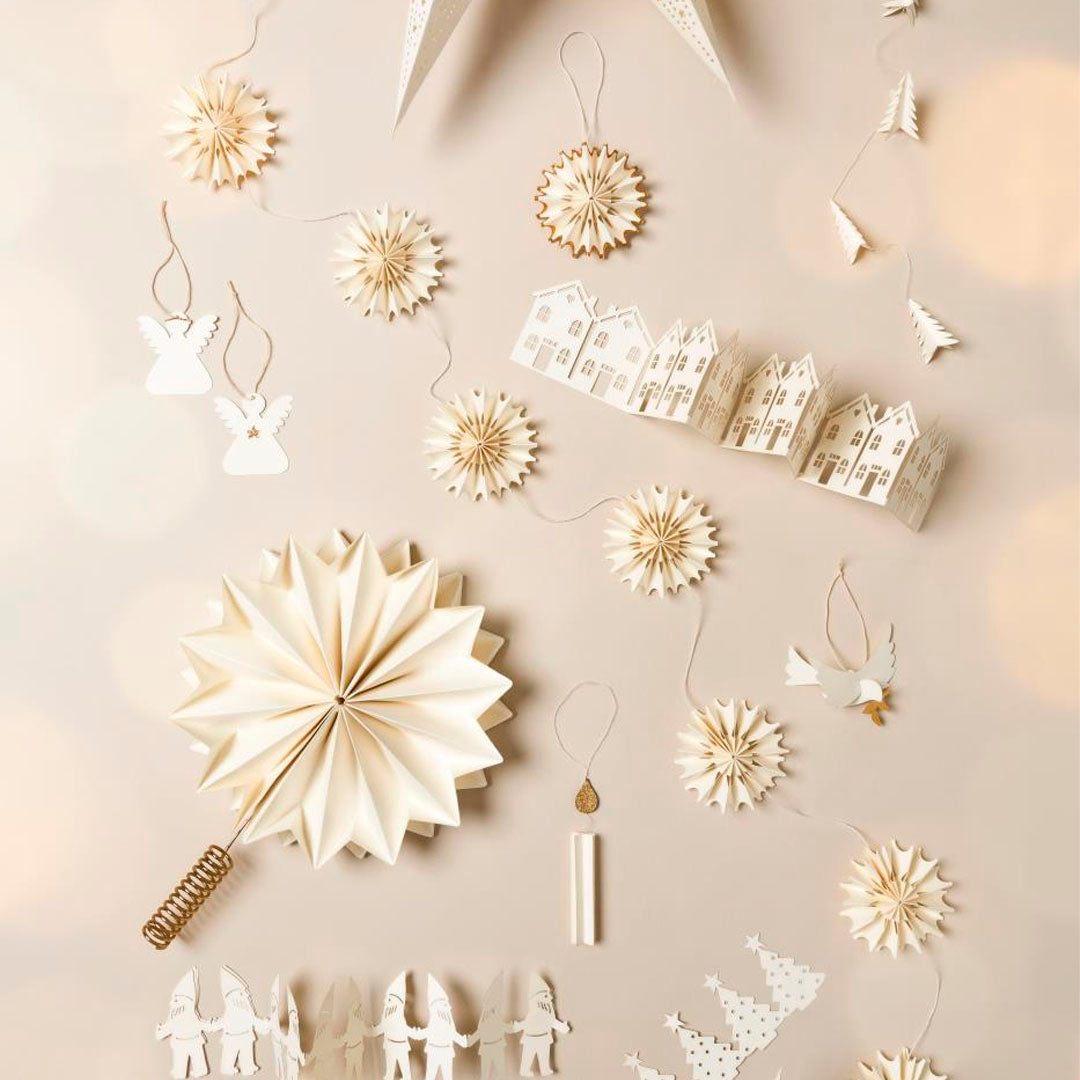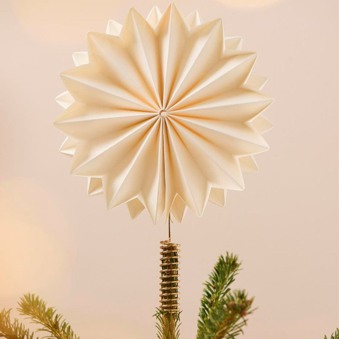 Topstjerne i hvidt papir med messingfarvet holder. En enkel og stilfuld juletopstjerne, perfekt til at pynte toppen af juletræet med et klassisk og elegant udtryk.