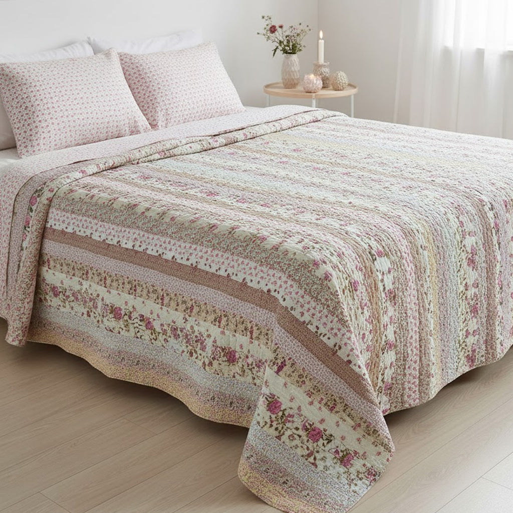 Patchwork Sængetæppe i Blomsternuancer er et stort, håndquiltet sængetæppe, der kombinerer et væld af florale mønstre i varme og romantiske farvetoner. De lange, lodrette patchworkstriber skaber et elegant og harmonisk udtryk, som bringer et blødt, hyggeligt og farverigt præg til soveværelset. Med sine generøse 240x240 cm er det ideelt til en dobbeltseng.