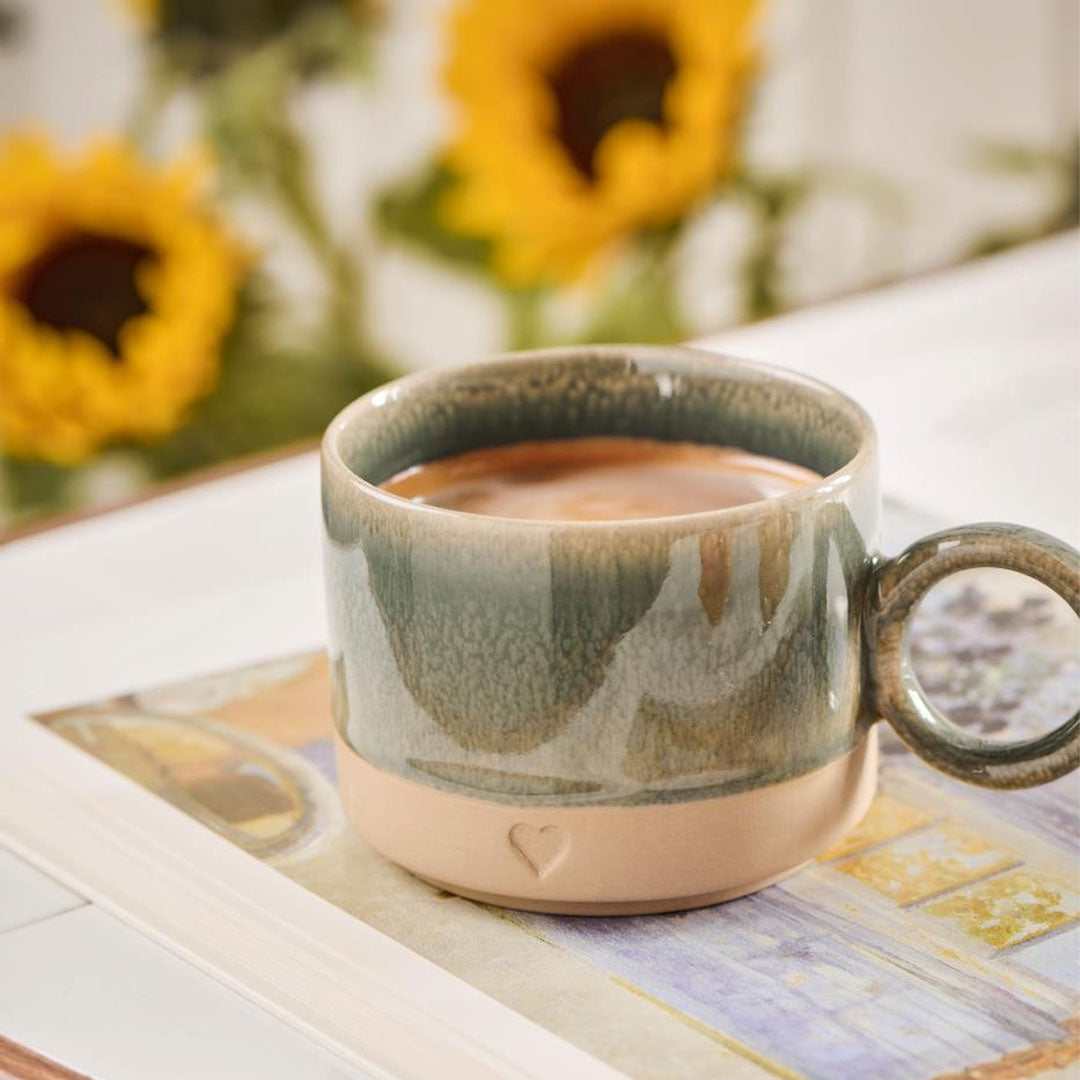 Et krus med hjerte og holdning. Dette charmerende Heart-krus i mat brunt stentøj med diskret grøn kant emmer af varme, enkelthed og rustik æstetik. Den bløde silhuet og det naturlige lerlook giver kruset et roligt og autentisk udtryk – perfekt til hyggelige stunder ved bordet.