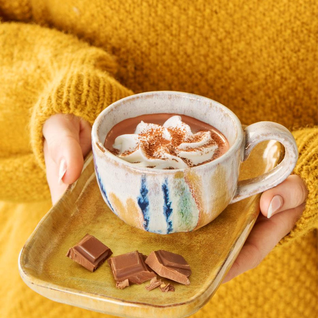 Dette stilfulde Trosa-stentøjskrus med hank har en klassisk, afrundet form og et fantastisk design. Glasuren består af et mix af blå og brunlige nuancer, der danner et abstrakt mønster henover koppen og giver den et autentisk håndmalet look.