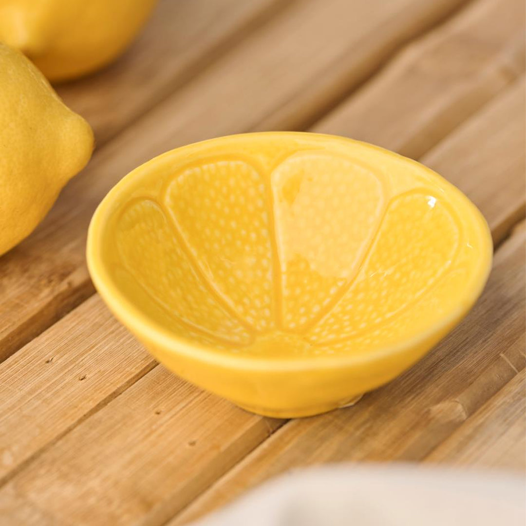 Dekorativ mini-skål i stentøj med citroninspireret design og klar, gul farve. Skålen tilfører borddækningen et friskt og legende udtryk og er perfekt til små serveringer, snacks, dips eller som en dekorativ detalje på bordet. Den kompakte størrelse gør den ideel både til hverdagsbrug og festlige anledninger.