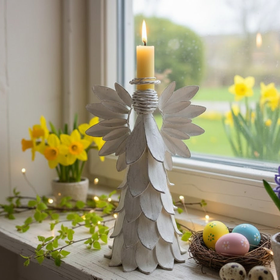 Englen fungerer smukt som centerpiece på et dækket påskebord, i vindueskarmen eller som en symbolsk figur året rundt. Det rustikke og tidløse design passer perfekt ind i både klassisk og moderne nordisk indretning – en enkel måde at skabe varme og eftertanke i hjemmet.