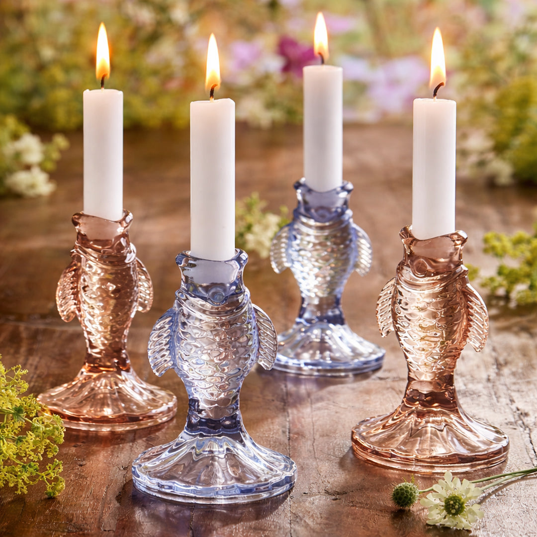 En lysestage med maritim charme. Disse dekorative fiskestager i farvet glas kombinerer legende design med et elegant udtryk og spreder et hyggeligt, stemningsfuldt lys, uanset hvor de placeres.
