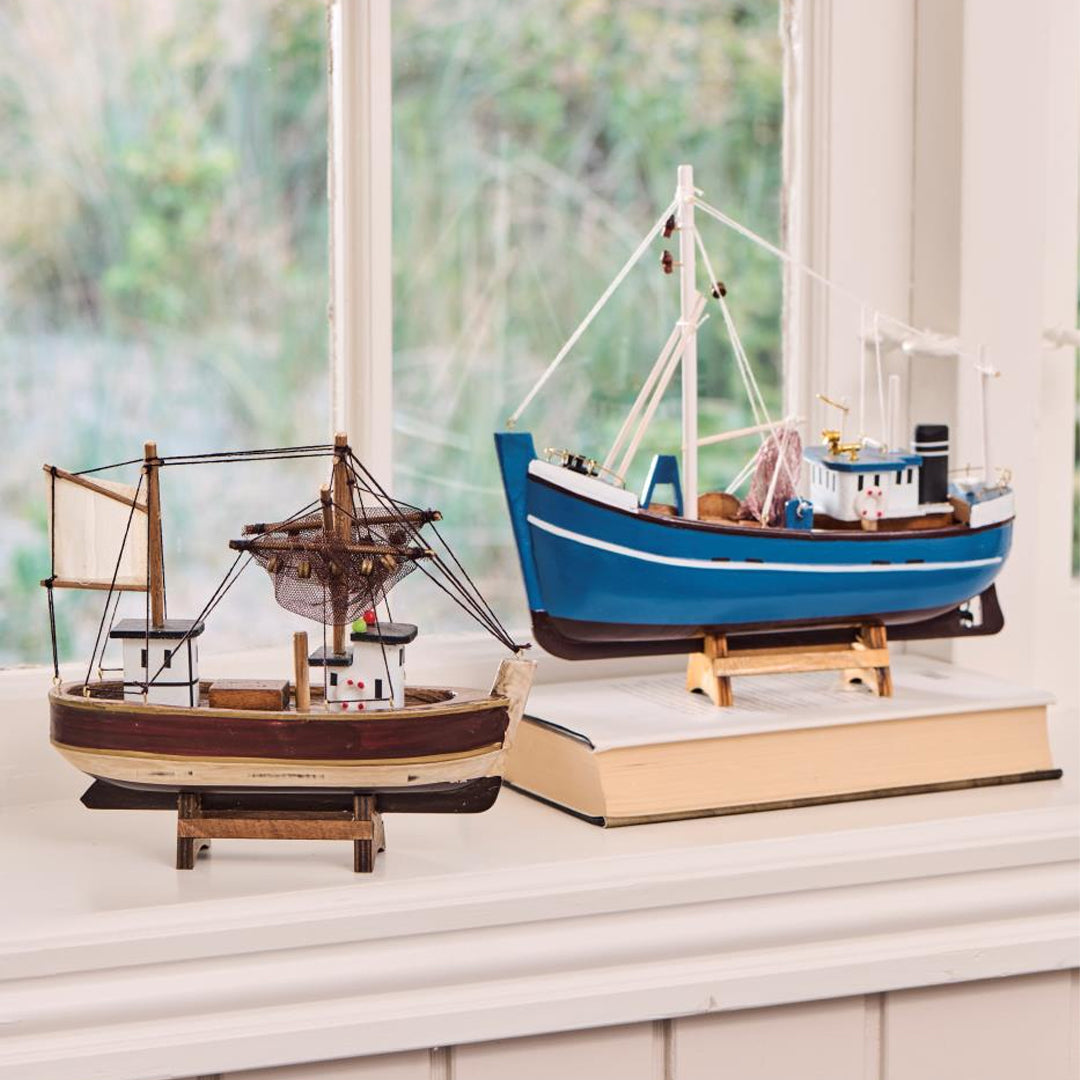 Denne kutter med blå farve og skorsten bringer både liv og ro til din boligindretning, og dens fine detaljer gør den til et tidløst og dekorativt valg.