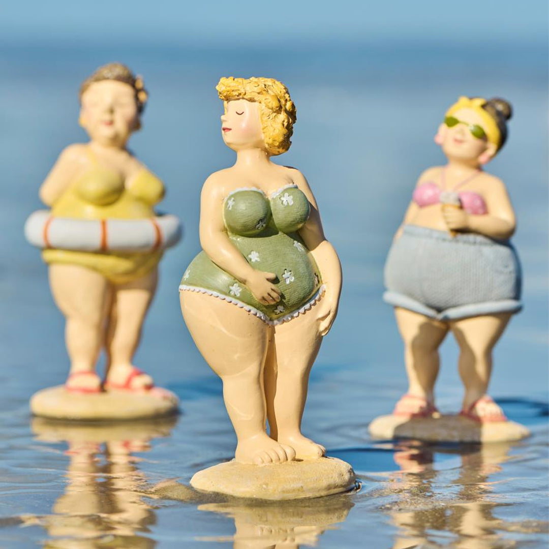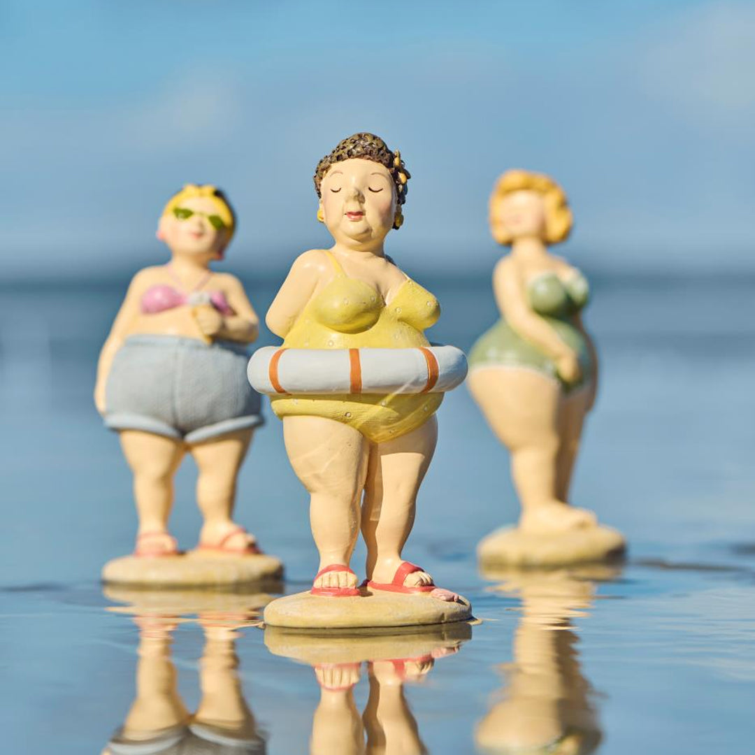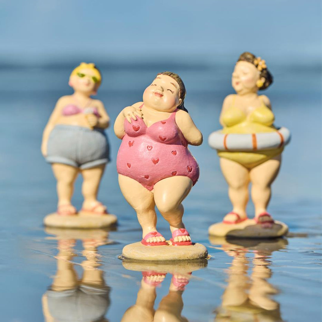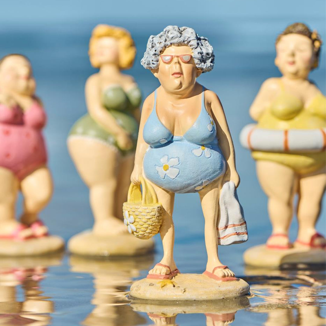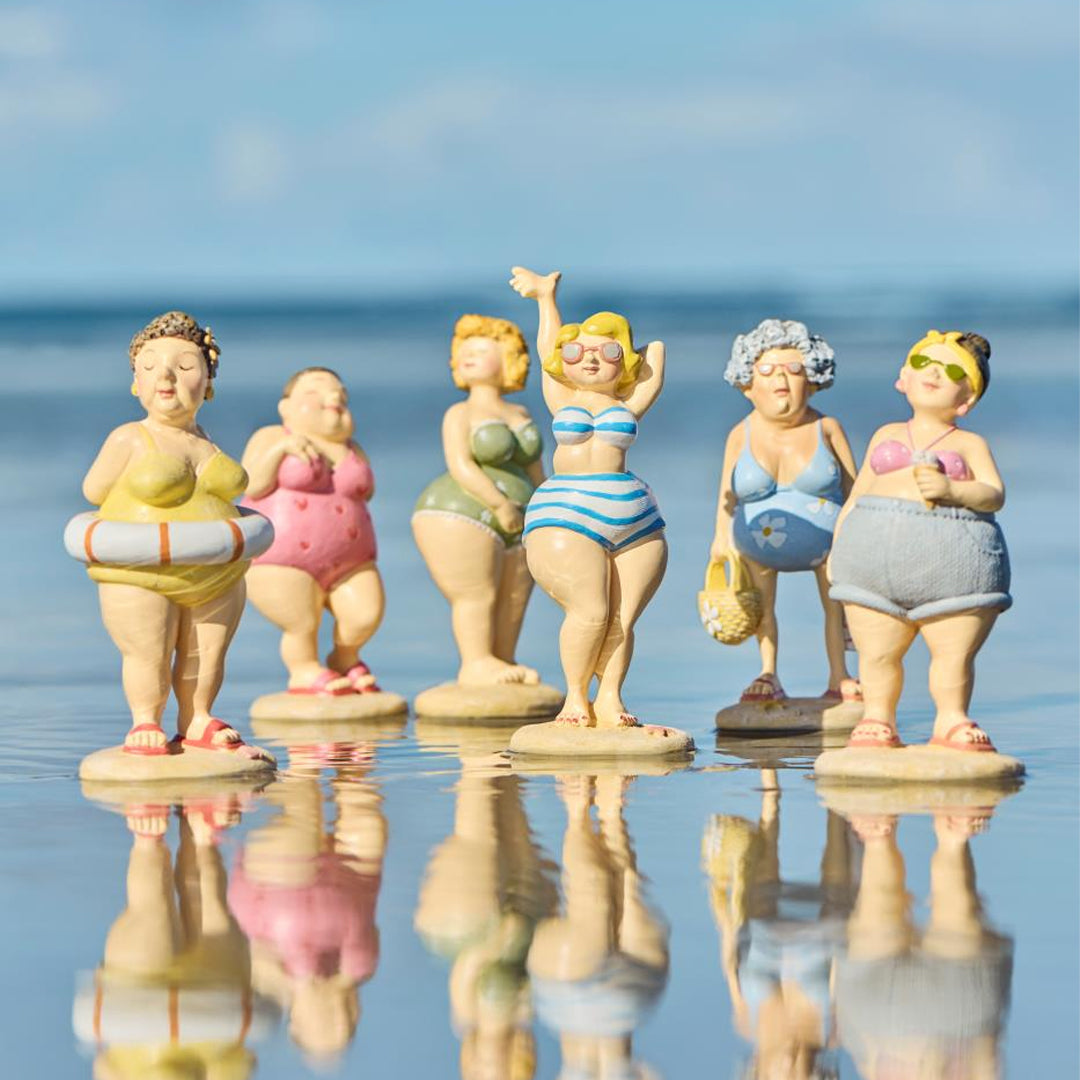 Disse stranddronninger i farverigt badetøj udstråler selvtillid, charme og masser af personlighed. Hver figur står som sin egen lille karakter – og sammen spreder de varme, humor og smil, uanset hvor de placeres.