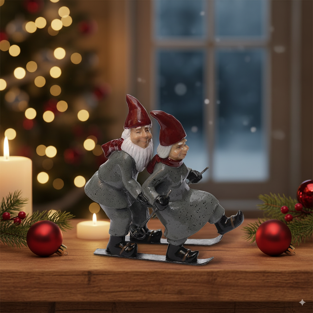 Tilføj både charme og julehygge til dit hjem med dette fine nissepar på ski fra Harvesttime. Figuren viser to nisser, der står sammen på ski og udstråler en skøn vinterstemning.