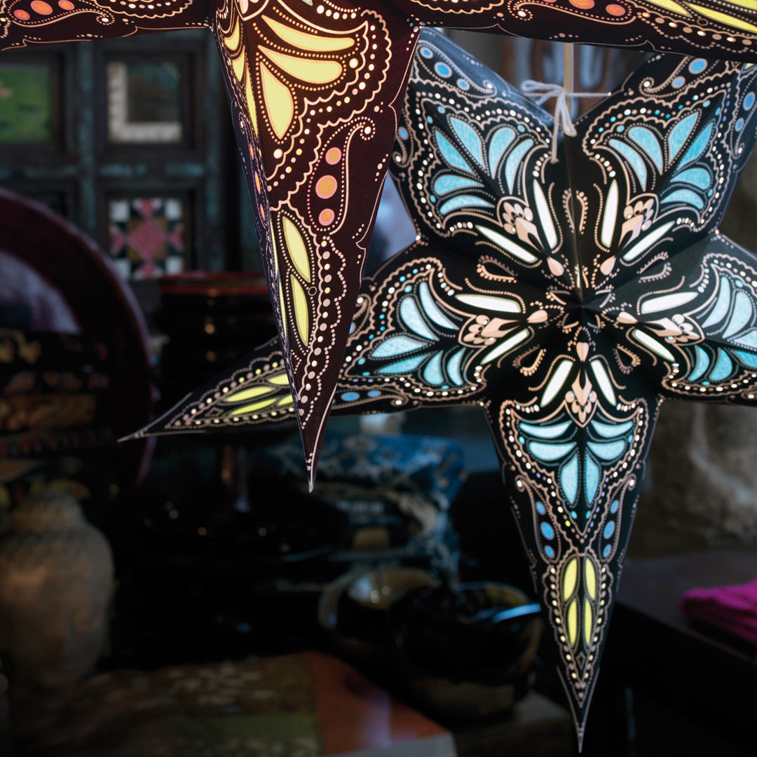 Jaipur Black Turquoise er en elegant papirstjerne i sort med smukke detaljer i turkis, grønne og lilla toner. Når lampen tændes, lyser de farvede mønstre igennem udskæringerne og skaber et varmt, farverigt og stemningsfuldt skær. Med sin diameter på 45 cm er denne lille model perfekt til vinduer, hyggekroge eller som dekorativ belysning hele året.