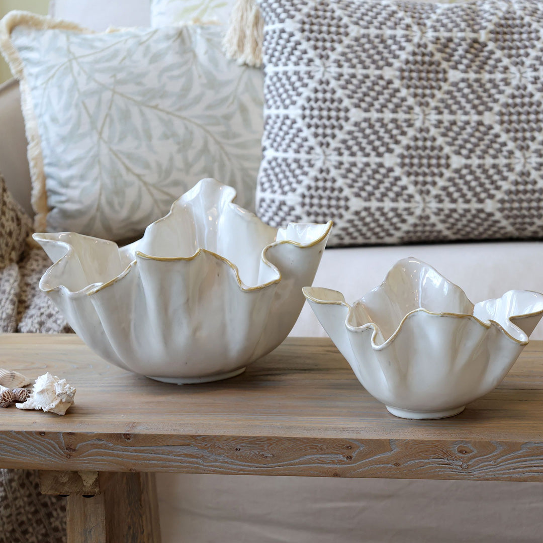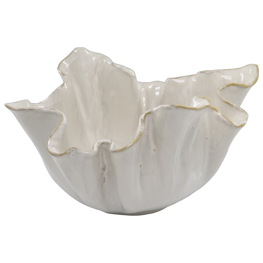 Elegant fad i stentøj med karakteristisk foldet kant, der giver et håndlavet og eksklusivt udtryk. Den antique creme farve tilfører varme og ro og passer perfekt ind i både klassisk og moderne indretning. Ideelt som dekorativt midtpunkt på bordet, til frugt eller som stilfuld servering.