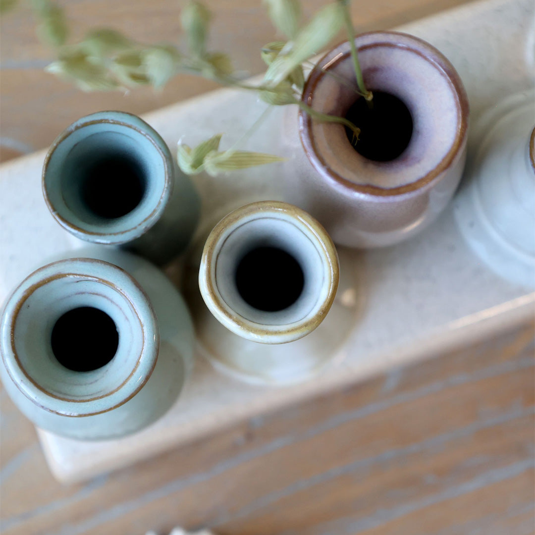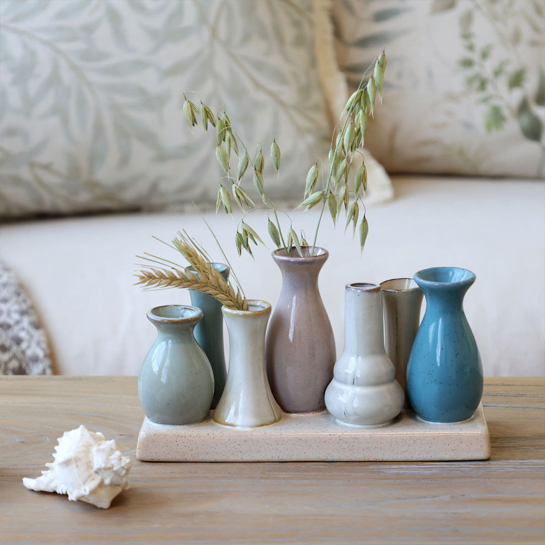 Dekorativt sæt med små vaser samlet på et fad, udført i stentøj med smukke, afdæmpede farver. Perfekt til enkelte blomster, grene eller tørrede stilke og ideel som centerpiece på bordet eller i vindueskarmen. Et lille statement, der skaber ro og variation i indretningen.