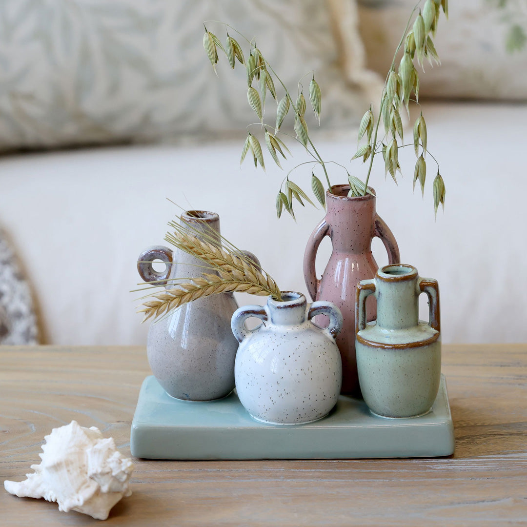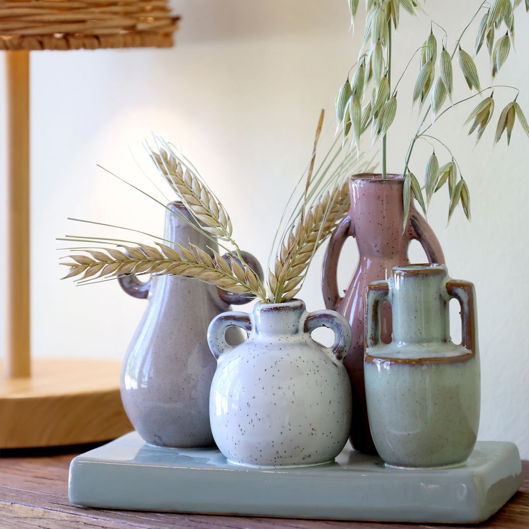 Kompakt og dekorativt sæt med små vaser samlet på et fad i stentøj. De afdæmpede farver skaber et roligt, håndlavet udtryk, perfekt til enkelte blomster eller tørrede stilke. Ideel som centerpiece på bordet, reolen eller i vindueskarmen.