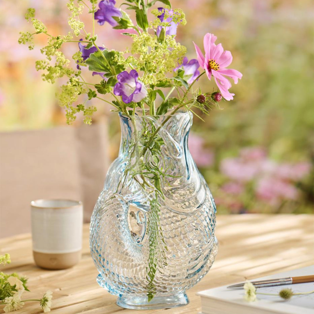 En vase med humor og karakter. Denne lyseblå fiskevase i glas fungerer både som blikfang og naturlig samtalestarter i indretningen. Det legende formsprog og den friske farve giver vasen personlighed, samtidig med at det transparente glas bevarer et let og elegant udtryk.