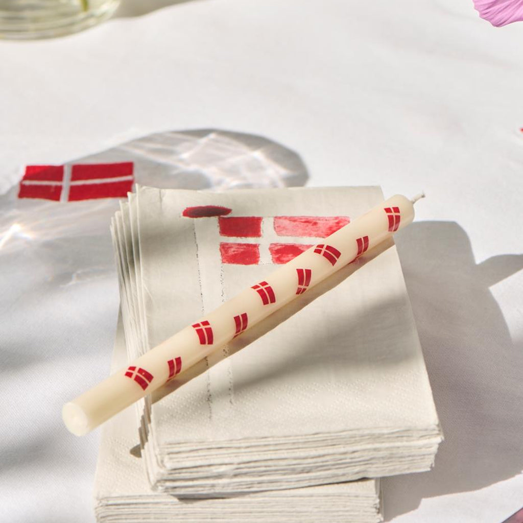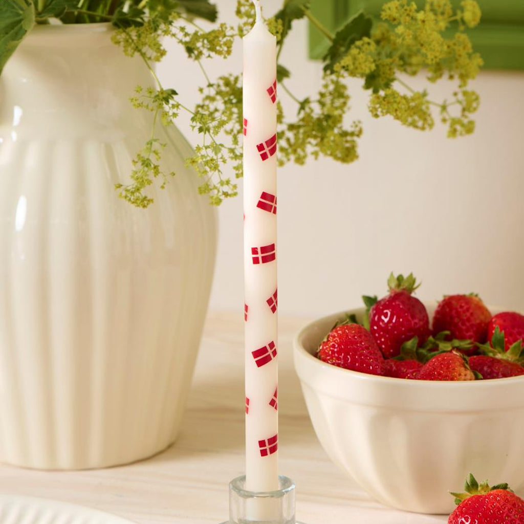 Skab en festlig og stemningsfuld borddækning med disse høje og elegante kertelys dekoreret med Dannebrog. Lysene er ideelle til mærkedage, fødselsdage, højtider og andre særlige anledninger, hvor der gerne må være et strejf af dansk tradition.