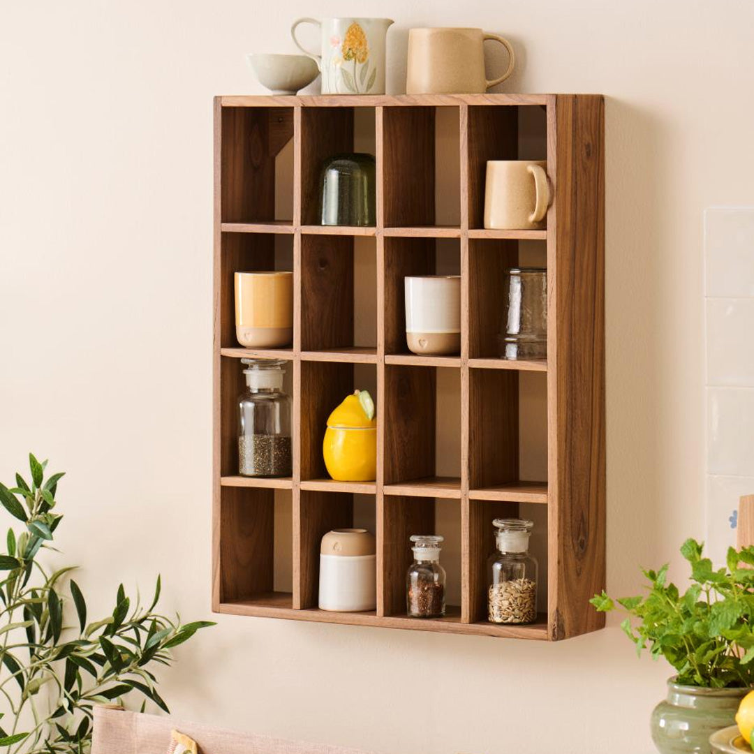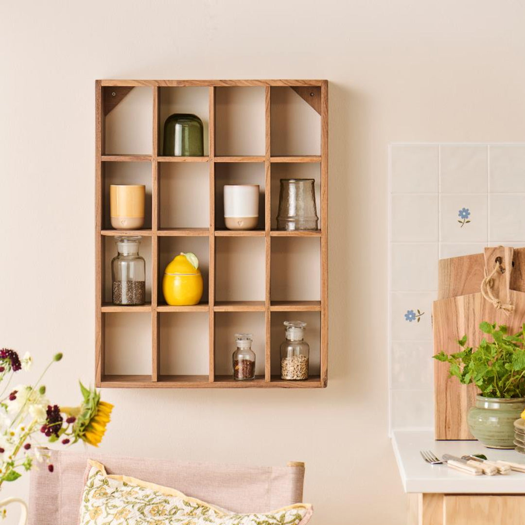 Dekorativ væghylde i træ med 16 åbne rum, der giver fleksibel opbevaring og et let, luftigt udtryk. Det åbne design uden bagbeklædning gør hylden ideel til køkken, stue eller spisestue, hvor den både kan bruges funktionelt og dekorativt. En karakterfuld UNIKA-hylde med fokus på form og naturligt materiale.