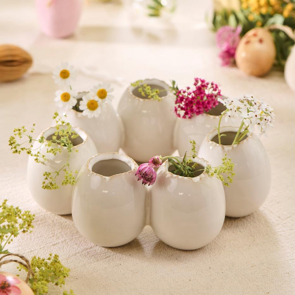 Tilføj en unik og stilfuld detalje til din borddækning med denne smukke keramiske vase designet som en æggering. Perfekt til at arrangere 7 enkelte blomster og skabe en elegant og dekorativ opstilling til påsken eller forårsdekorationen.