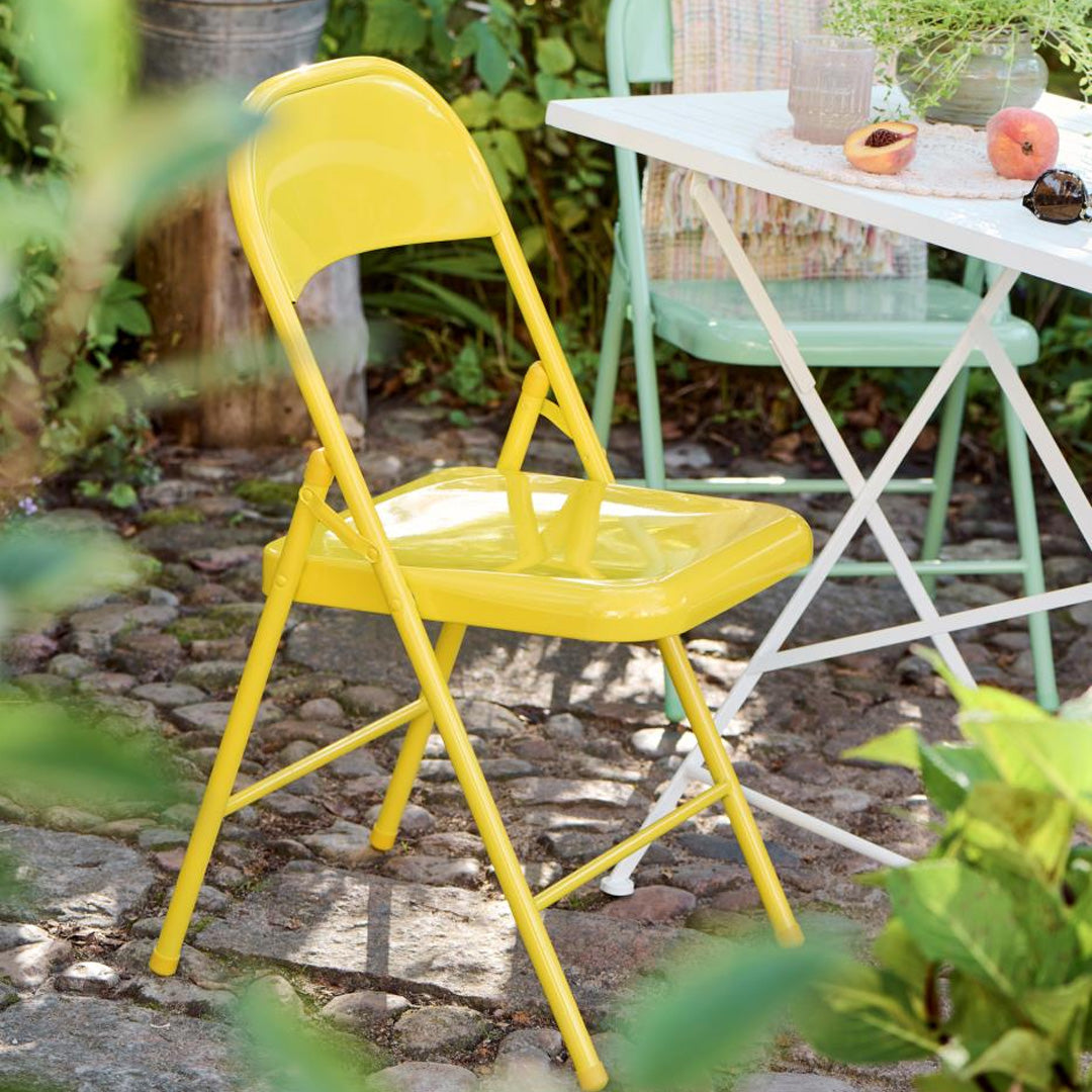 Denne lyseblå klapstol i metal kombinerer funktionalitet med et let og moderne udtryk. Det sammenklappelige design gør den ideel, når du vil spare plads uden at gå på kompromis med komfort. Perfekt som ekstra stol til terrasse, have eller køkken.